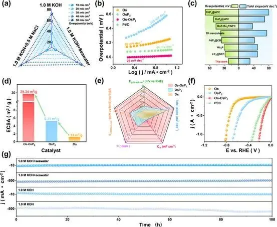 实验和理论分析表明,Os-OsP2界面优化了电子结构:锇(Os)位点通过降低d带中心加速水的解离,而OsP2通过界面溢出促进氢的脱附,共同降低了HER的能垒。