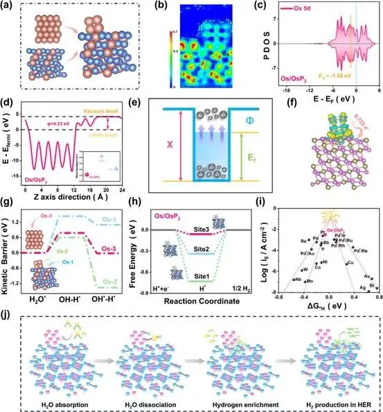 图5.a)Os、OsP2和Os-OsP2的结构模型。b)Os-OsP2的ELF图(红区表示电荷聚集,蓝区表示电荷耗散)。c)计算了Os-OsP2模型的表面或界面Os位置的d带中心。d)Os-OsP2的功函数。e)电子转移示意图。f)Os-OsP2的DCD。g)水在不同部位的解离动力学势垒。h)不同位置上的氢析出。i)HER的Os-OsP2(红色正方形)和常见金属催化剂(黑色圆圈火山图))。j)Os-OsP2的碱水分解示意图。