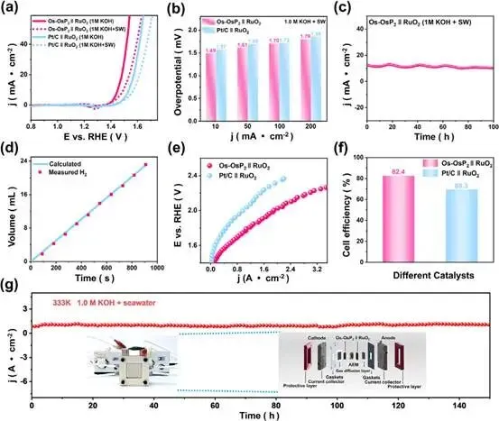 图6.a)Os-OsP2‖RuO2和Pt/C‖RuO2的整体水分裂的LSV曲线。b)比较在碱性海水中不同电流密度下所需的电压。c)Os-OsP2‖RuO2在1.0mKOH+海水中的计时电流曲线。d)产气量随时间变化的理论值和实际值。e)AEM电解槽中总的海水电解LSV曲线。f)比较了Os-OsP2‖RuO2和Pt/C‖RuO2的催化效率。(f)1A cm-2处的计时安培曲线和AEM电槽的照片。