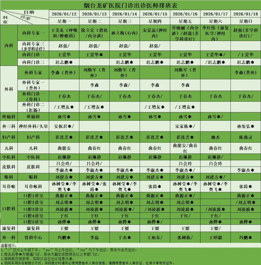 >【便民信息】烟台龙矿医院门诊出诊医师排班表(2026.1.12-2026.1.18)