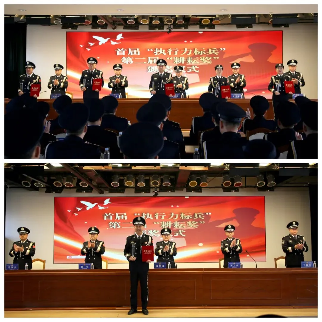 表彰颁奖环节温暖而庄重。首先,戒毒所党委班子成员为晋升警衔代表颁发警衔晋升证书,共同见证他们在戒毒矫治岗位上的成长蜕变与责任担当。随后,为首届“执行力标兵”和第二届“耕耘奖”获得者颁奖。