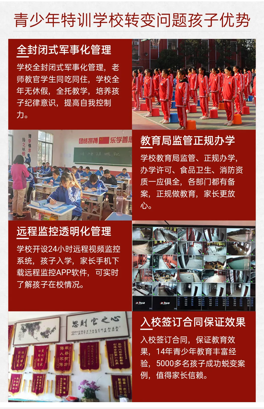 五、我们青少年叛逆网瘾特训学校开设24小时远程视频监控系统,实施透明化管理,邀请家长督学,保障孩子安全。