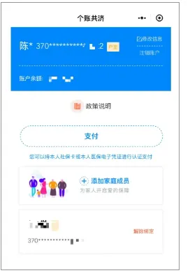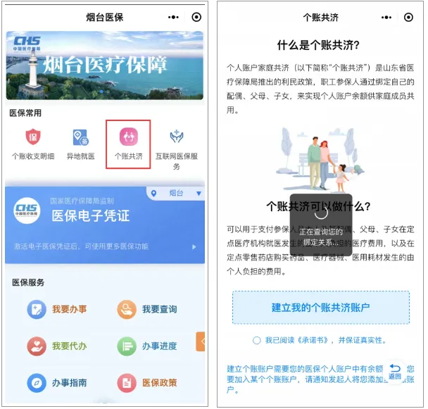 通过“烟台市医疗保障局”微信公众号设立(变更、取消)个账共济账户。关注并打开“烟台市医疗保障局”微信公众号,点击“医保服务”—“办事大厅”—“个账共济”,进行实名实人认证。