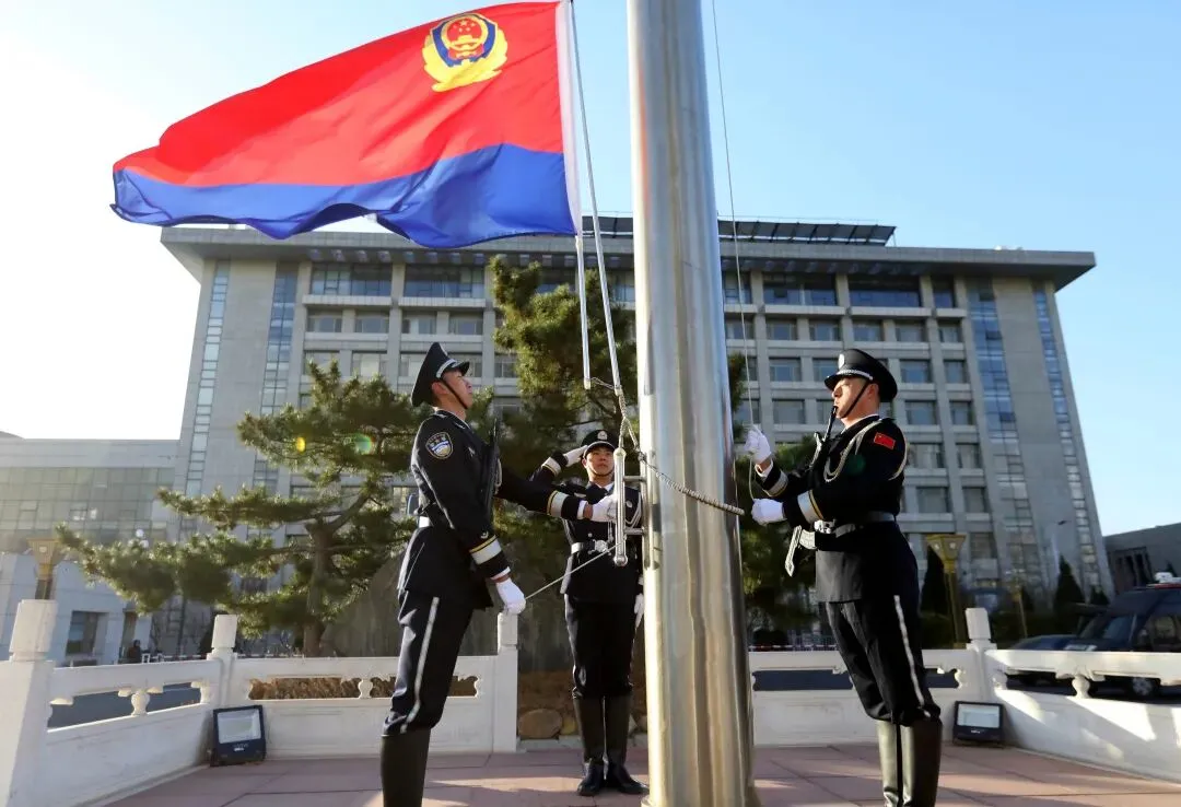 上午8时,仪式正式开始。仪仗队伍迈着铿锵有力的步伐,护卫警旗走向升旗台。伴随着嘹亮的中国人民警察警歌,鲜艳的警旗冉冉升起、迎风飘扬。身着礼服、整齐列队的全体民警,向警旗庄严敬礼。随后,全体民警重温公安机关人民警察誓词。