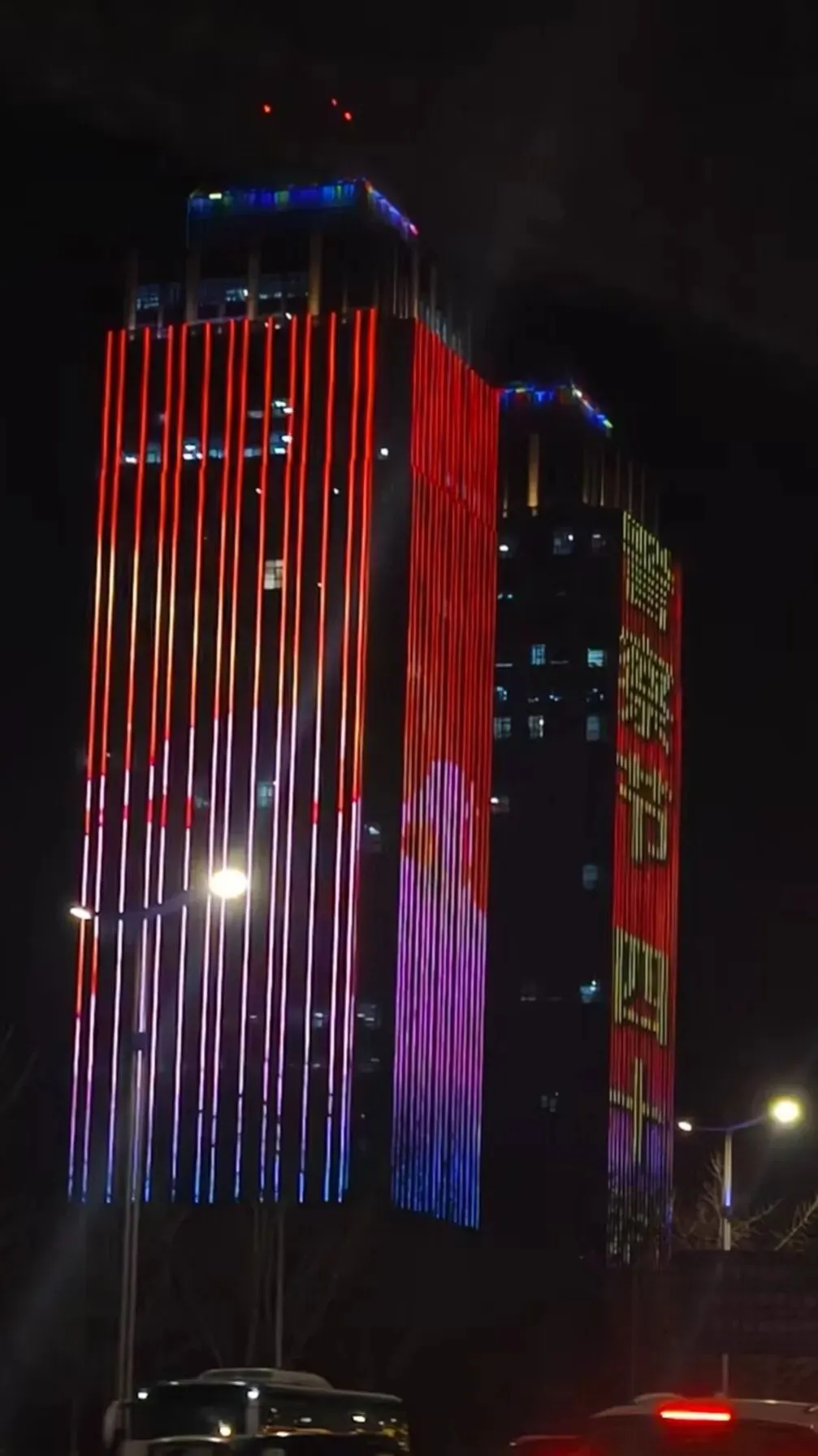 璀璨光影与城市夜景交相辉映,以“热烈庆祝第六个中国人民警察节”“四十载守护平安110勇毅前行”为核心主题的标语在楼体间循环闪耀,为日夜守护城市平安的人民警察送上最真挚的致敬与祝福。