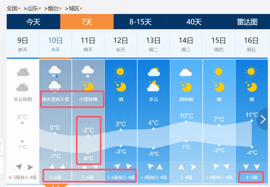 10日夜间到11日白天,烟台北部和威海天气阴有中到大雪局部暴雪,烟台南部地区天气多云间阴局部有小雪,其他地区天气晴到少云。滨州、东营、潍坊、日照和半岛地区北风5~7级阵风8~9级转南风4级阵风5~6级,其他地区北风4级阵风5~6级转南风3~4级。最低气温:鲁西北、鲁中山区和半岛内陆地区-10~-8℃,局部-12℃左右,其他地区-6℃左右。