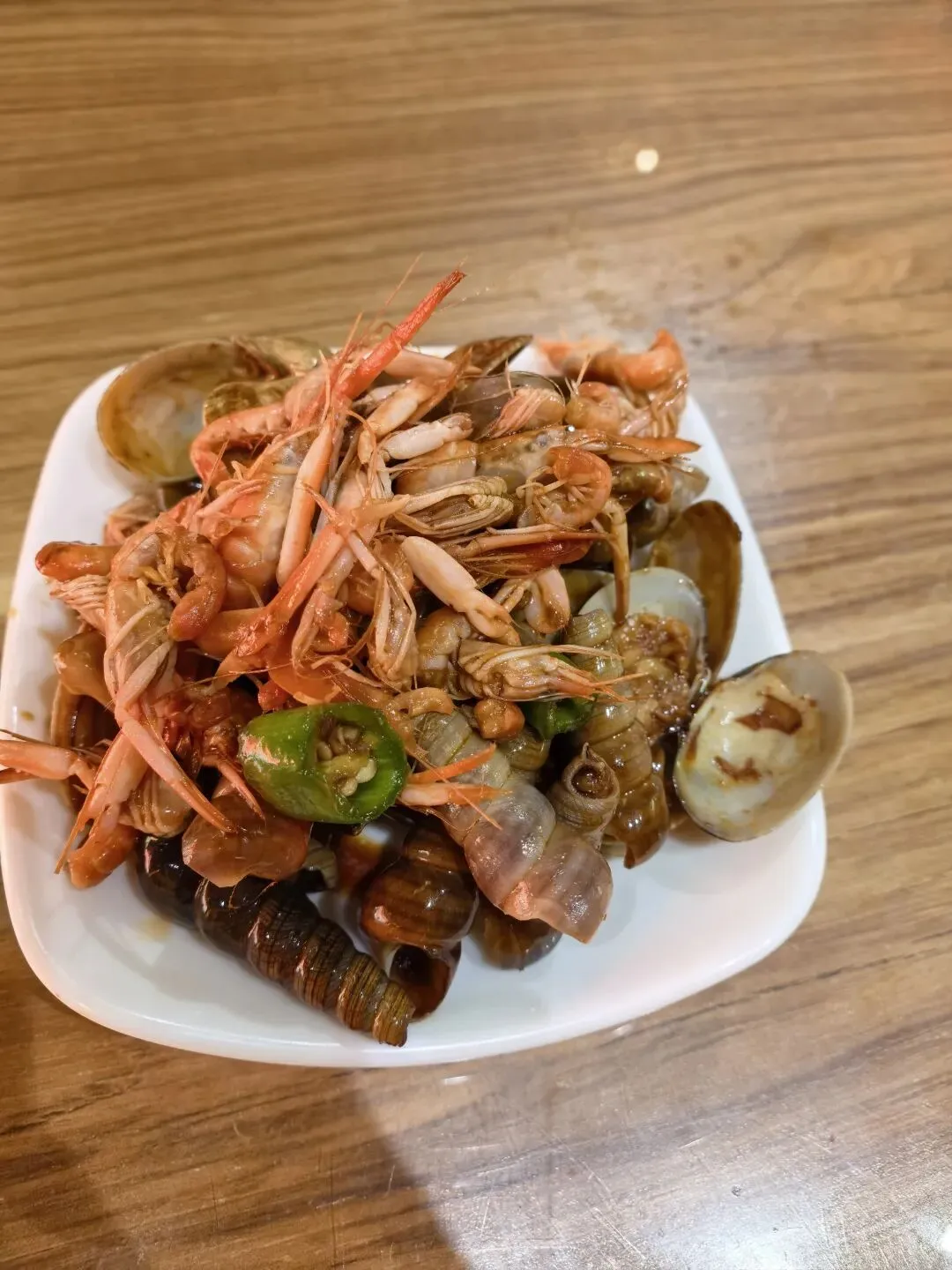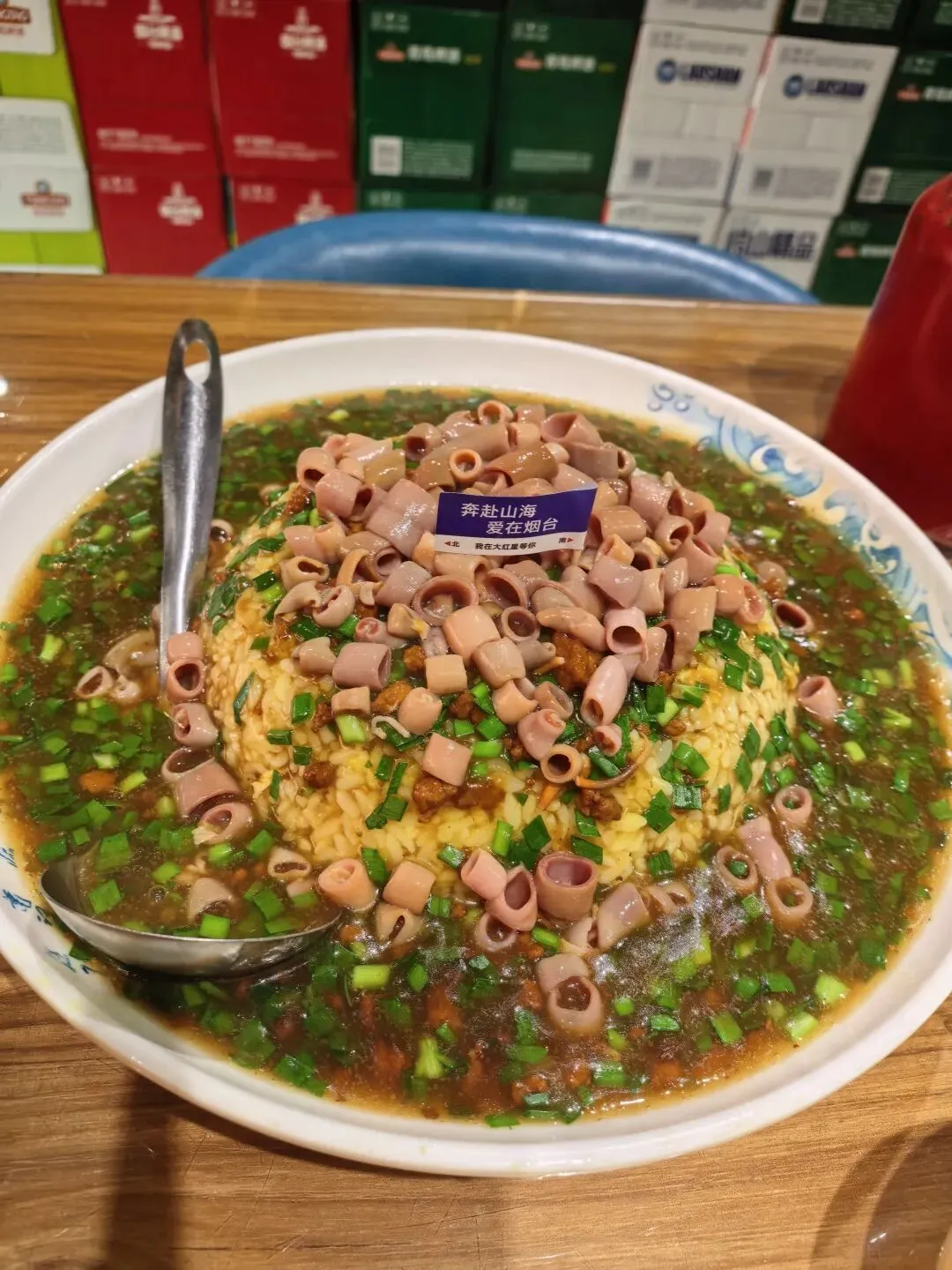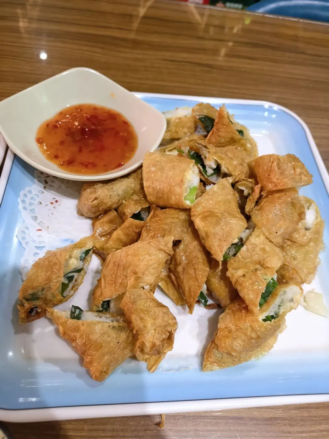 虎皮黄鱼卷,外面是炸得酥脆的豆皮,里面卷的是鲜嫩的大黄鱼肉,空口吃感受到更多的是豆皮的味道,沾上一点甜辣酱就不会油腻了。超大份海肠捞饭,两个人也没有吃完,点的时候服务员说这是双人份,实际大概足够三四个人吃收藏打卡送了一碟捞汁小海鲜。