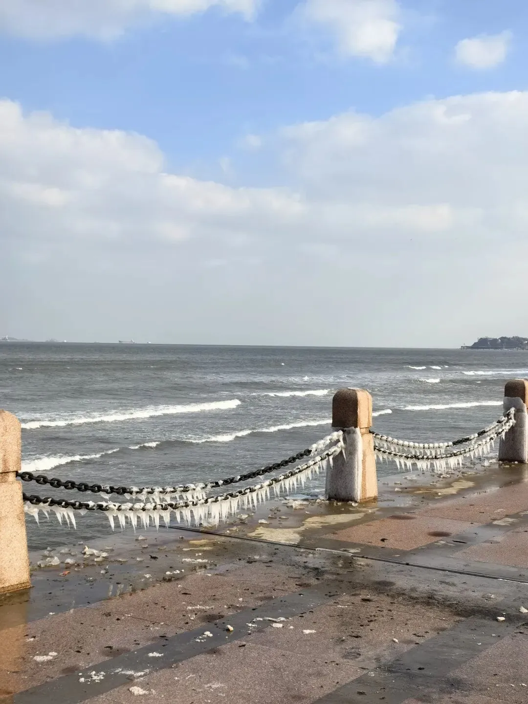 从烟台山这边沿着海岸线往月亮湾的方向走,海边的铁链上都结着厚厚的冰棱。
