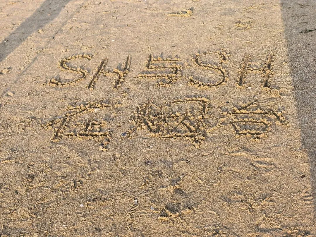 走一段就到了一片海水浴场,这里的沙子很细腻,可以写字。SH说,你猜这里的海鸥更多还是人更多?我觉得是卖海鸥食的人最多。到处都有大喇叭在叫卖“海鸥食,海鸥食,海鸥爱吃火腿肠!”在威海,海边卖的海鸥食基本都是字母饼干,烟台这边基本都是切成小块的火腿肠。