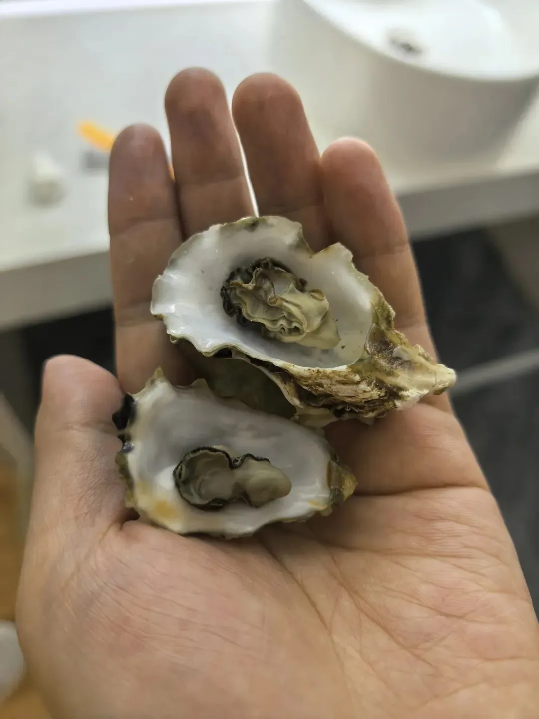 到月亮湾的主要目的是赶海,来之前还查了潮汐表,但是一路边走边玩,等到了这里已经快要涨潮了,据说赶海的最佳时机的退潮后,因为海水快速退去,而海滩礁石中的各种海货还没来得及找新的藏身之处。不过这并不影响我们赶海的快乐心情一个长满海蛎子的石头