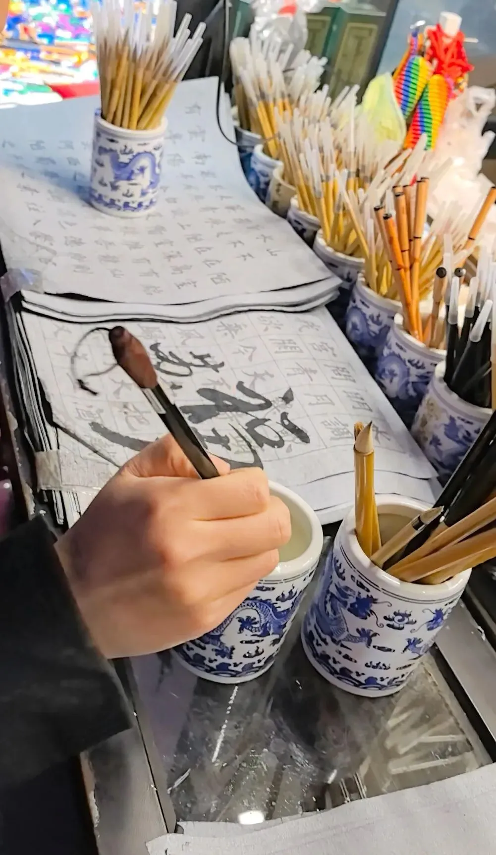 SH在一家卖毛笔的小摊处驻足不前,试了一支狼毫大号毛笔,说比去年他写对联的笔好用很多。