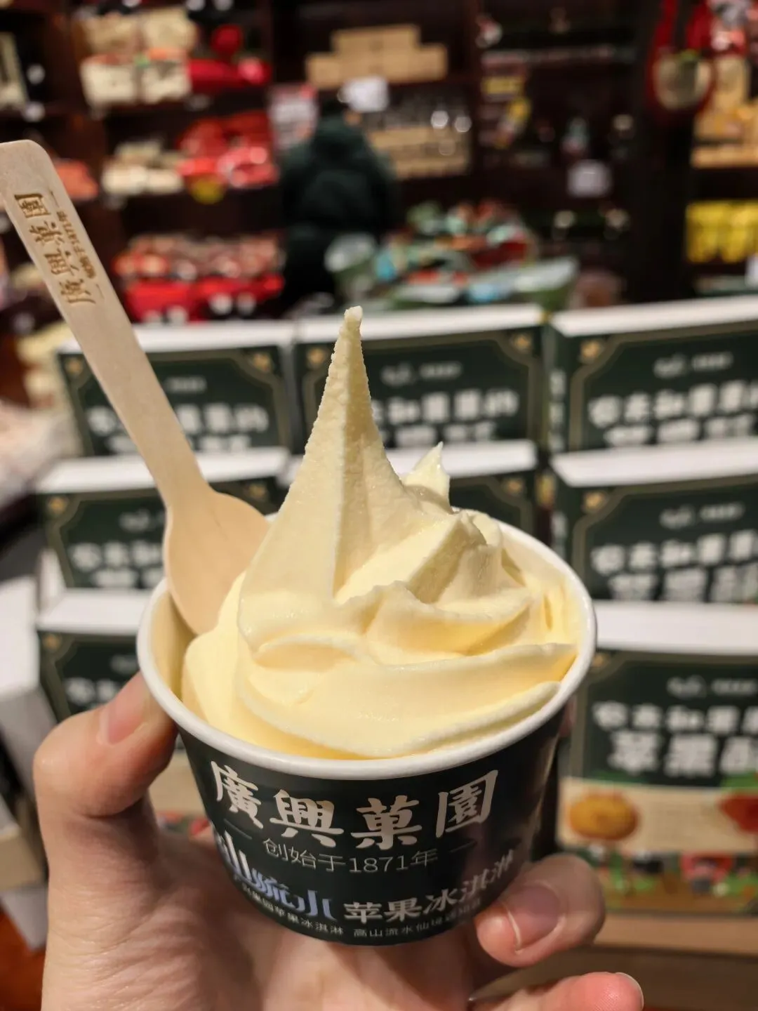 去了心心念念的广兴果园买鲜榨苹果汁,一口喝下去倒像是吃新鲜水果的味道,特别清新,我很喜欢冰淇淋并不是每家店都有,我们在所城里一店买了苹果汁,又跑去二店买的冰淇淋,冰淇淋有两个口味,一种是浓郁的苹果味,另一种是淡淡苹果味浓郁奶味,还可以双拼,我选了浓郁苹果味的,味道和小时候吃的苹果味仔仔棒很像。
