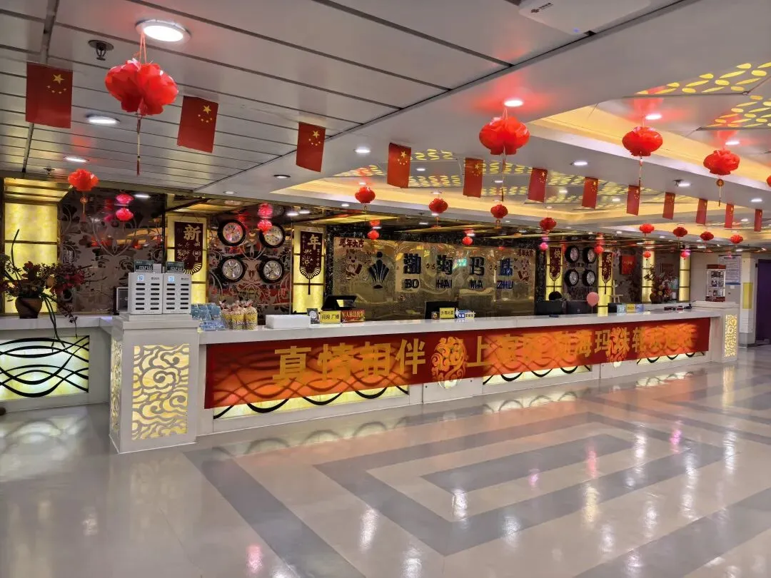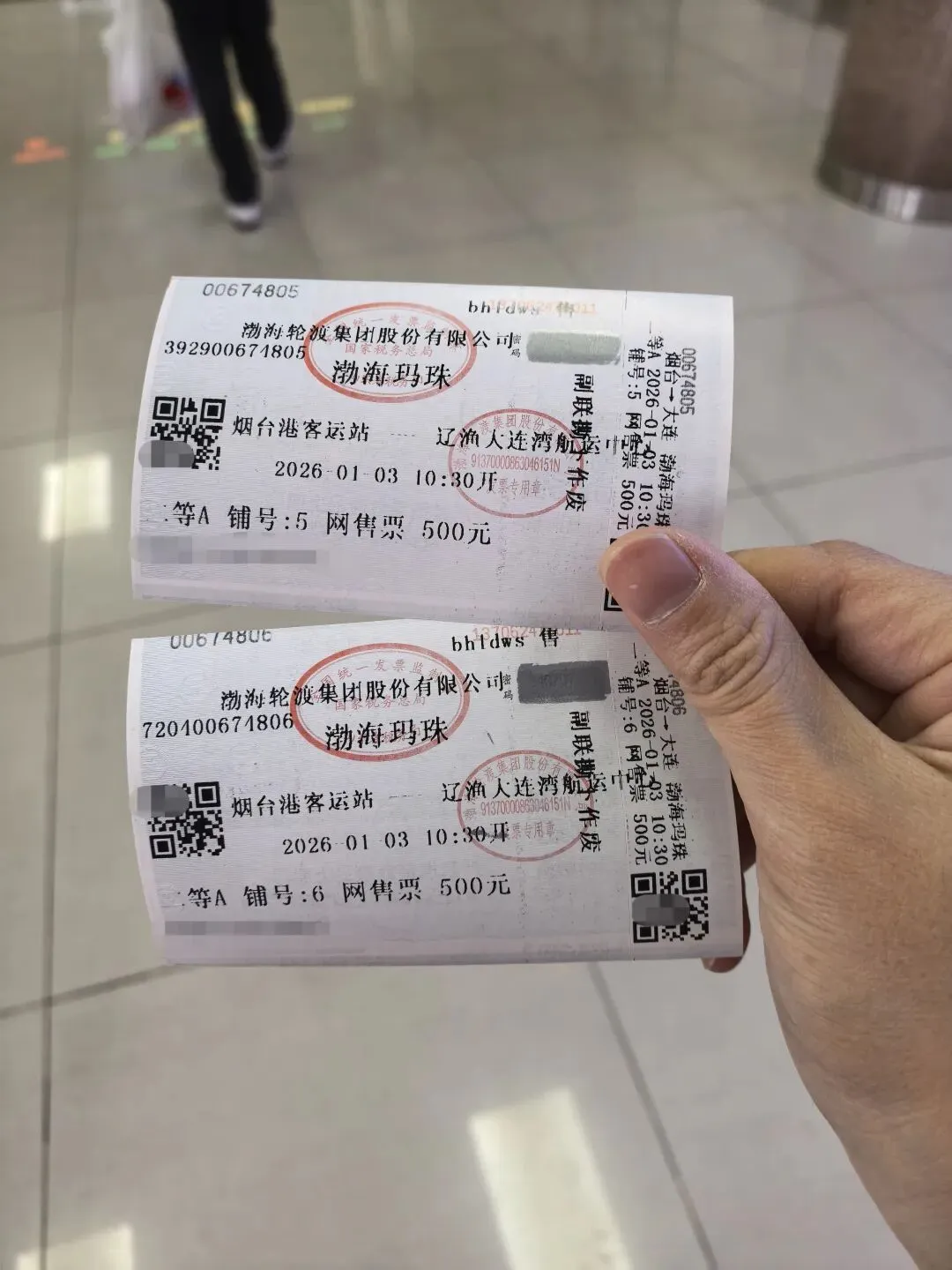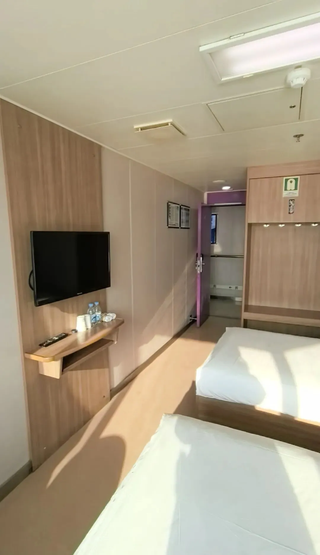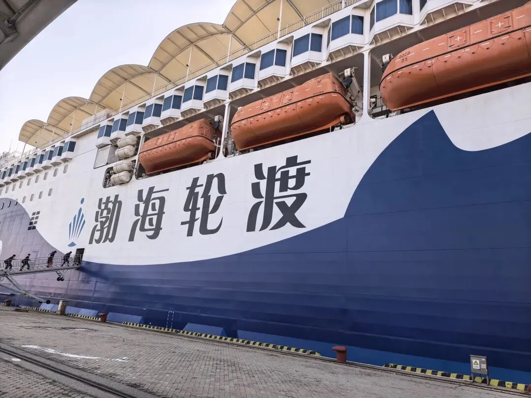 吃饭的时候给渤海轮渡的客服打了电话,询问是否可以带自热米饭上船,得到了肯定的答复后,我们就去超市购置了第二天在船上需要的物资。3号早上直接在酒店吃的早饭,定酒店的时候发现只要多加5块钱,就可以多双份早餐,果断预定。酒店早餐的种类并不太丰富,有据说是烟台特色的虾酱饼,吃完就去了烟台港客运站,接下来是本次旅行中最期待的轮渡部分。我们买了二等A,是有两张单人床有独立卫浴有超绝海景大窗的房间,票价是每人500块。我们的房间就是最上面一层突出来的一个一个蓝色玻璃小屋。经过安检和检票口后,还需要坐几分钟的摆渡车,把我们从售票厅运送到轮渡旁边。本次乘坐的是从烟台开往大连的渤海玛珠号,在百度上查了一下这艘轮船的相关信息上船时需要爬楼梯到4楼才能进到船舱里面,然后坐电梯到9楼领房卡,我们的房间就在9层我们的房间,进门是卫生间,有两张单人床,有电视,不过只有几个台