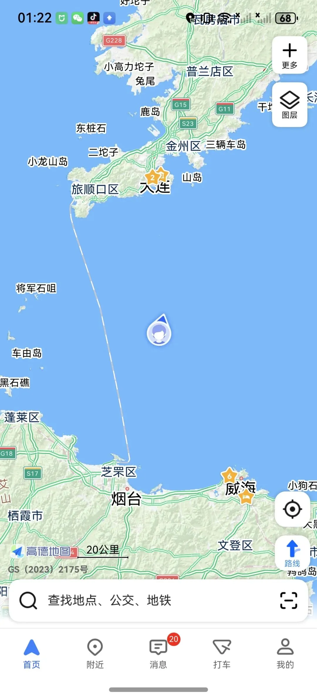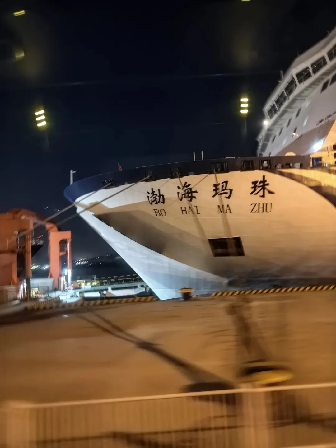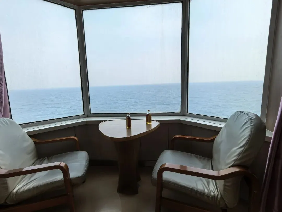 有超爱的海景大窗,在房间里就可以看海了,不用跑到甲板上。我们都贴了晕车贴,但当船真的离开港口之后,还是有不同程度的恶心头晕状况,好在我的症状比较轻。晕船的时候就去甲板吹吹风,刚走起来不久我们就去了甲板上,这时候天气还有点灰蒙蒙的,觉得头晕缓解以后又回到船舱里,各层都溜达了一下,在船上大多数时间里是没有信号的,但是一点也不会无聊,船上有棋牌室,KTV,抓娃娃机,游戏机,再拍拍照,我都觉得7个小时的航程太短了不够用。走出去两个小时,在房间的窗边可以看到海和天都变得蓝蓝的了,于是又跑去甲板上拍照中午吃了自热米饭后,我躺下睡了个午觉,睡醒后觉得神清气爽,恶心头晕的感觉已经全部消失了我在海上看了日落,又看了月亮,还在甲板上遇见了海鸥终于实现了坐船的愿望,截图了一张没有信号的定位在大海上的图片下船后有免费的摆渡车把旅游运送到大连站和大连北站,在车上拍到了船头晚上9点半进了家门,看到求婚的花花自己在花瓶里待了好几天依旧开得很鲜艳,我觉得幸福。