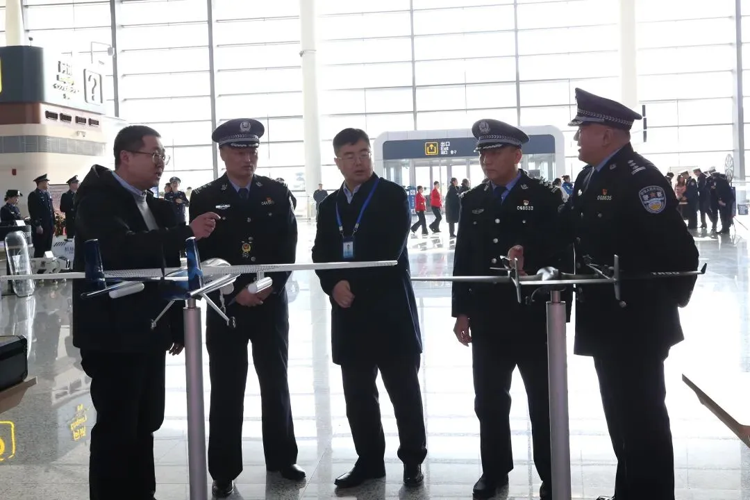▲烟台机场公司党委副书记、总经理李伟,烟台机场公司党委委员、副总经理罗玉民,局党总支书记、局长孙琳,局党总支委员、副局长杨栋,局党总支委员、副局长杜文峰,局党总支委员、候机楼派出所所长浦大凯参加活动
