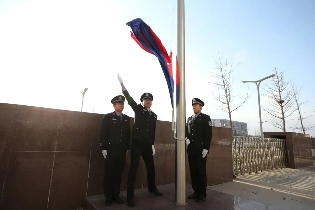 1月10日上午9时,升警旗仪式正式开始。烟台机场公安民辅警代表庄严列队,警容严整。