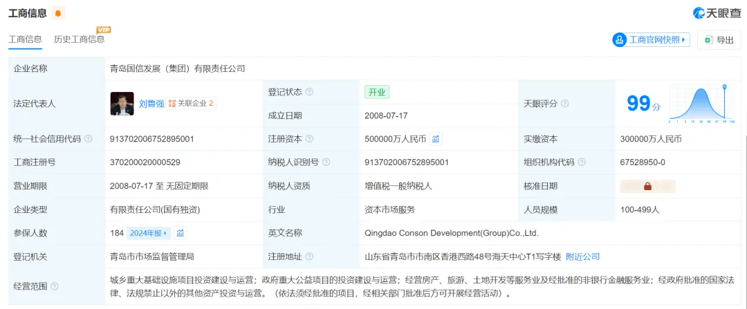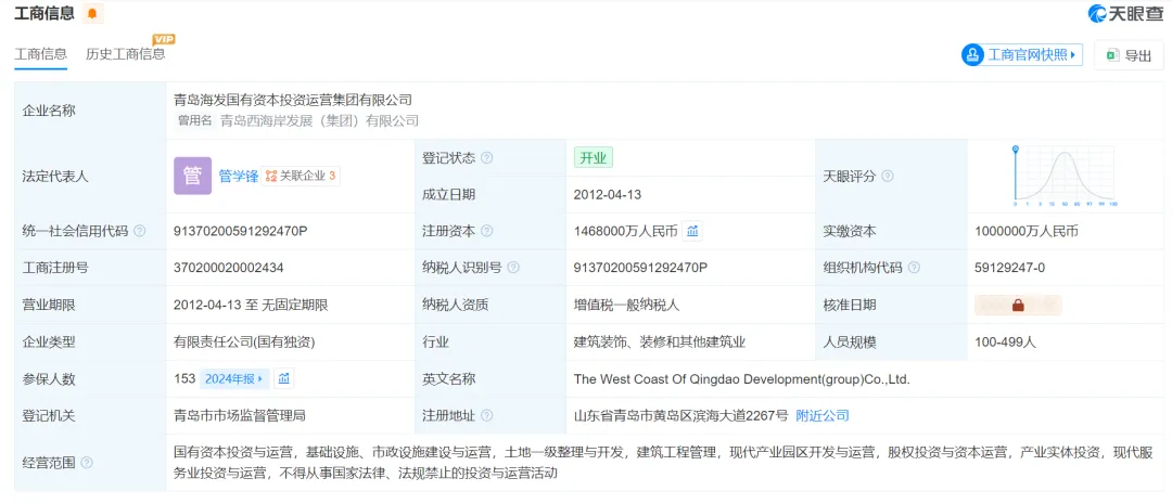 首先来看青岛海发,其是青岛市委、市政府批准成立的市直大型国有企业,截至2024年底资产总额达1500亿元。目前,企业官网已经更新,显示其注册资本达146.8亿元。