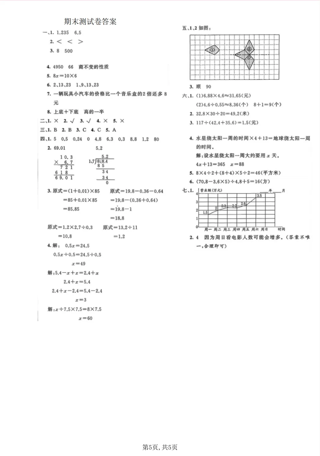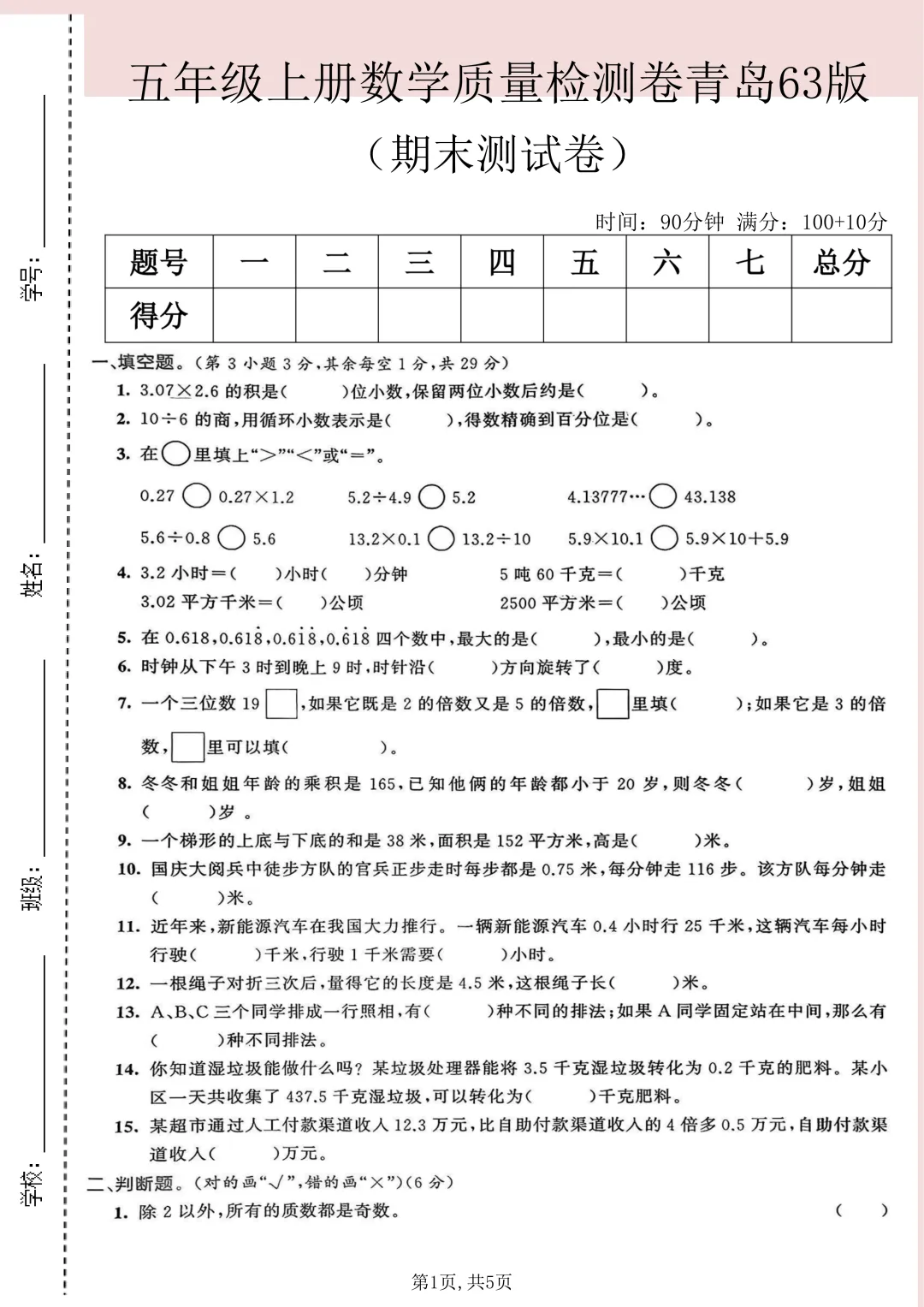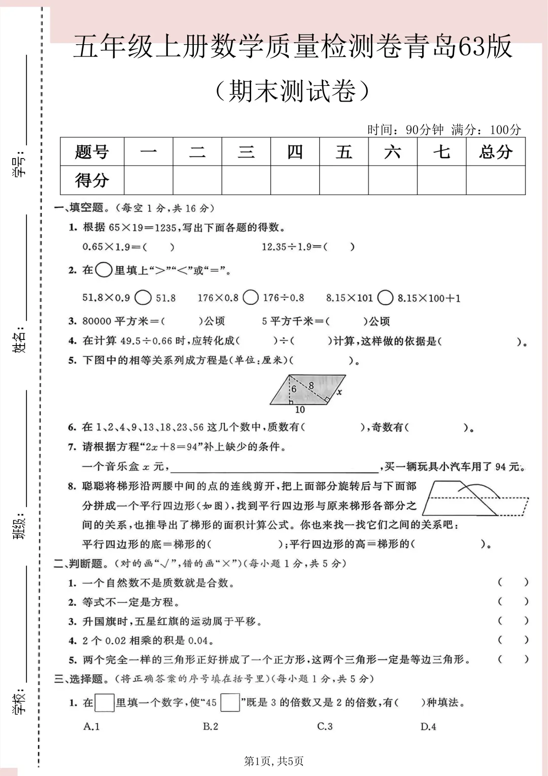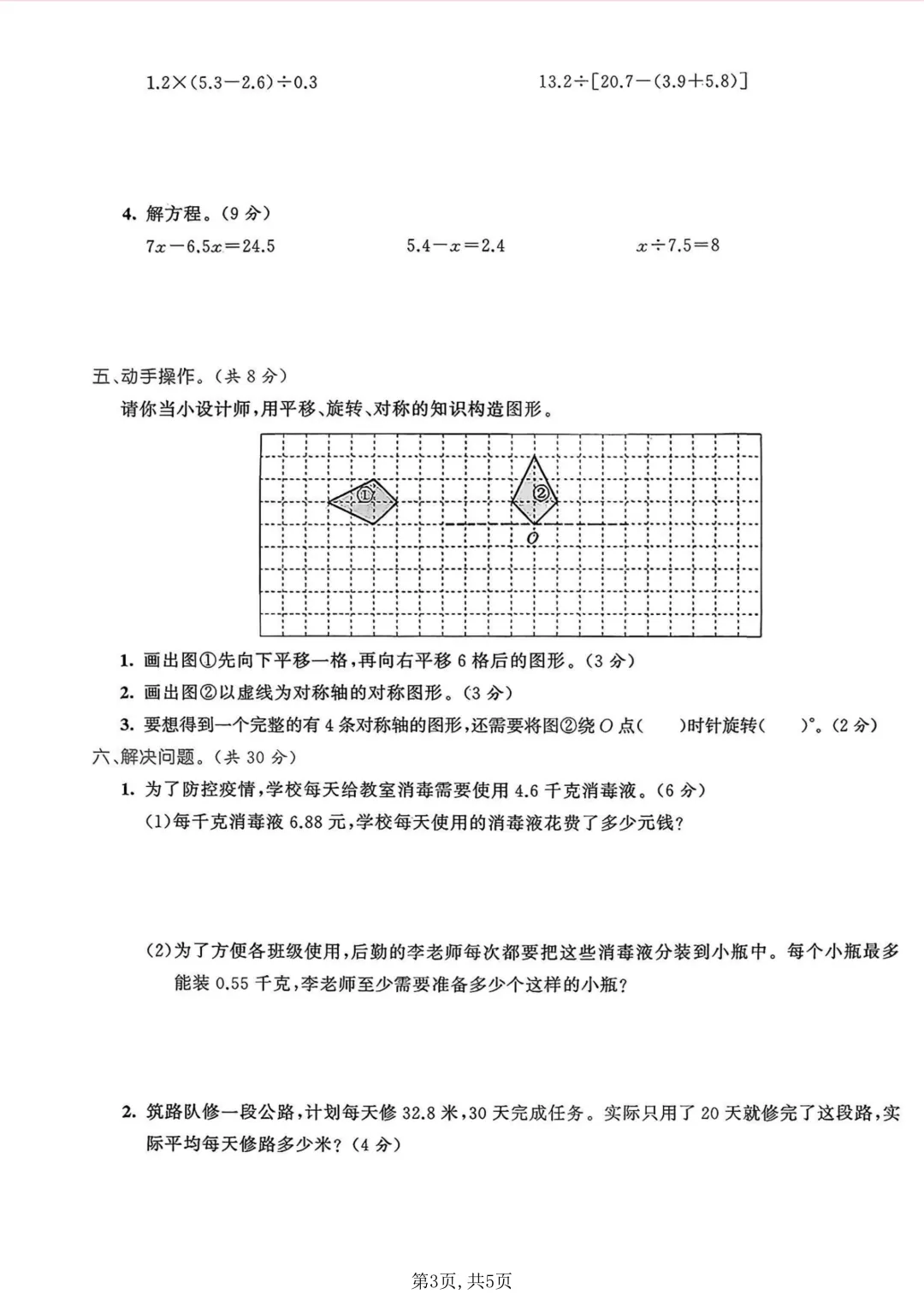 五年级数学小数运算易出错、图形面积不会算、方程应用难上手?3套期末检测卷(含答案)帮你精准提分!覆盖全册核心考点,题型全面,难度递进,适配期末复习~