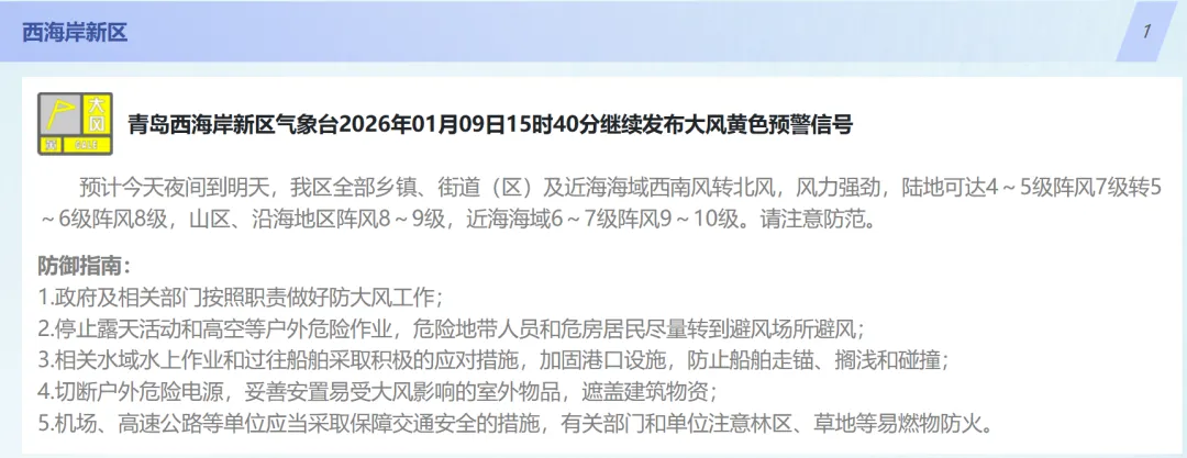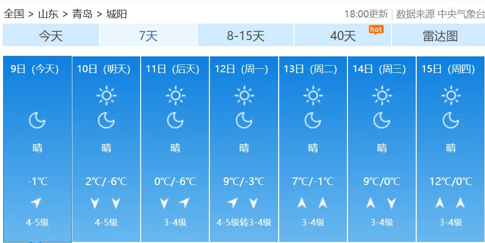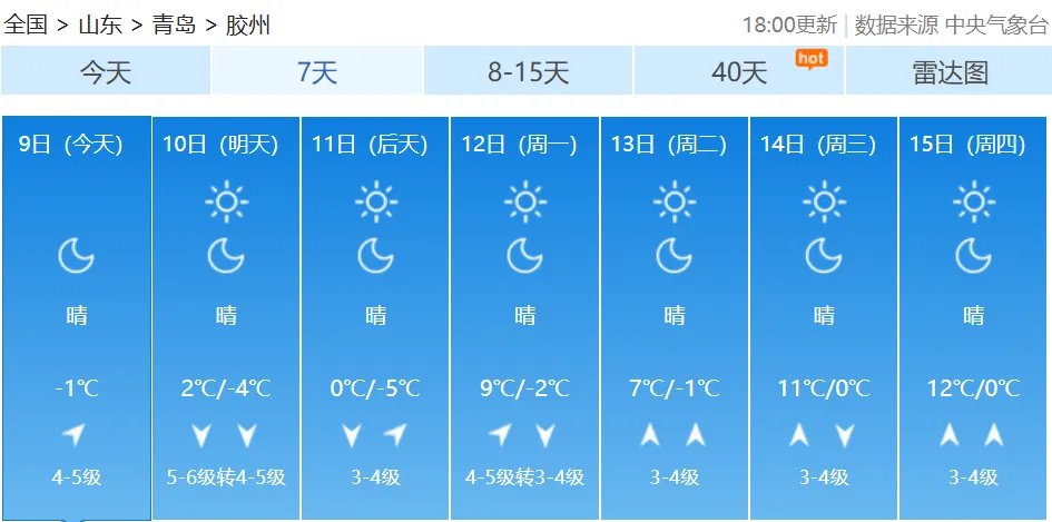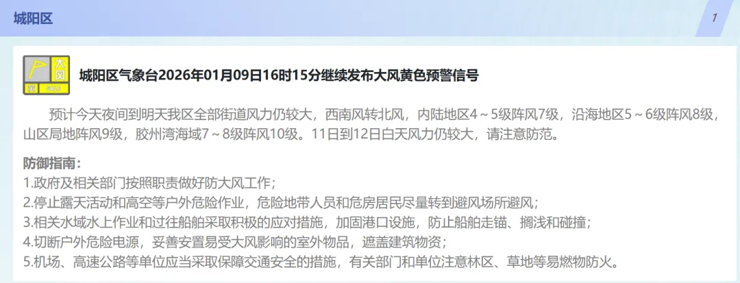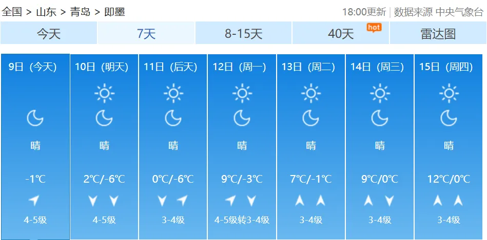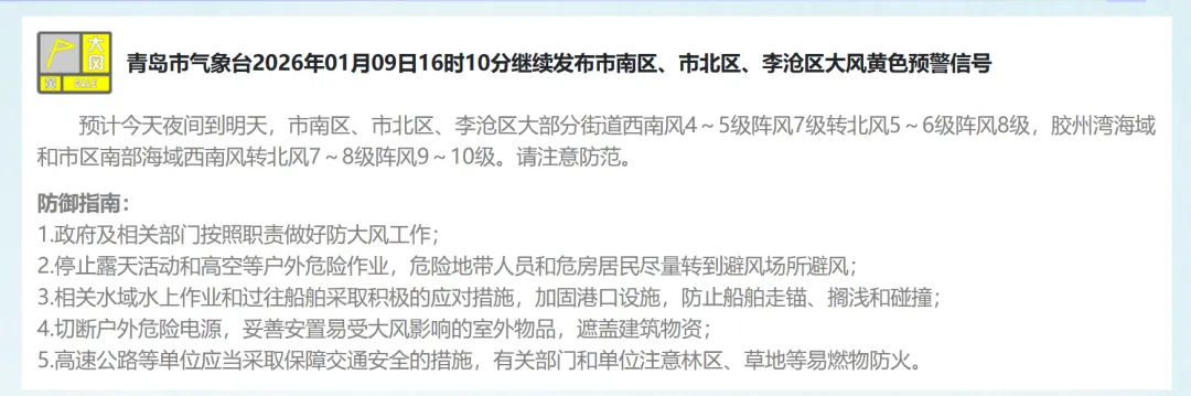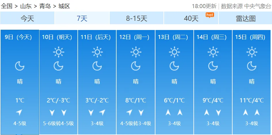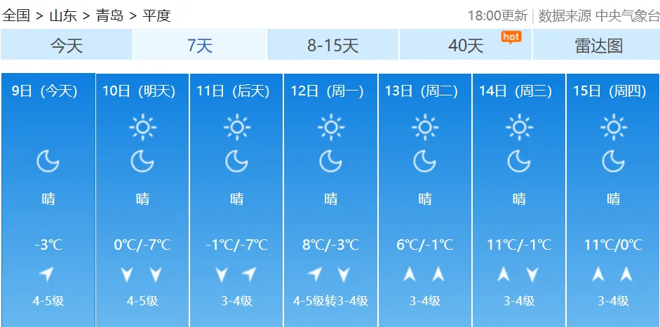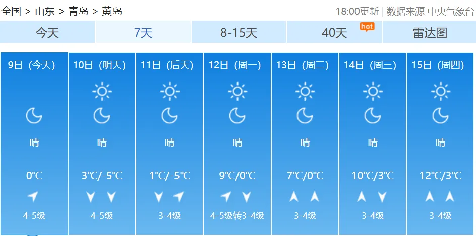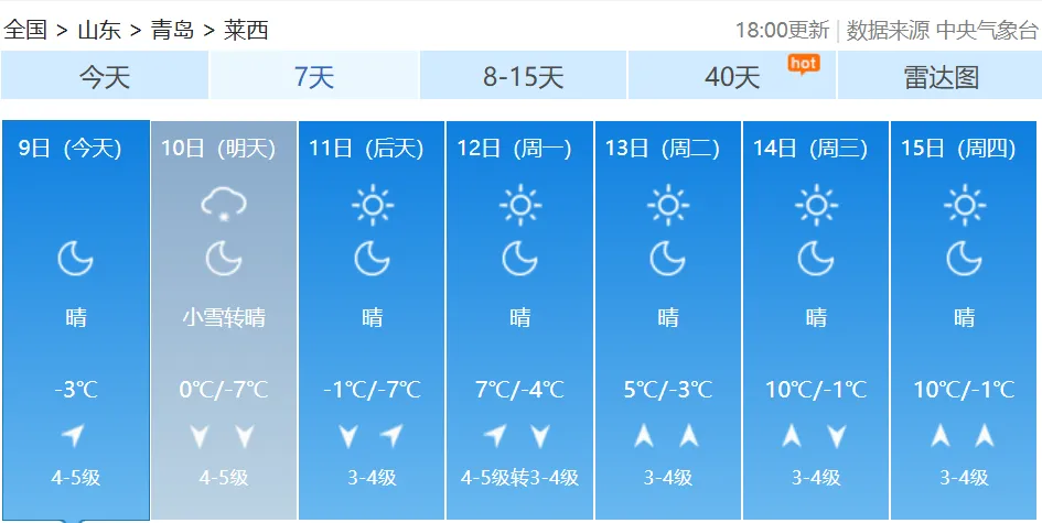 10日白天,我市以晴间多云天气为主,北部的平度、莱西有短时分散性小阵雪;全市的能见度转好,但是随着冷空气的深入,气温明显下降;10日夜间到11日早晨,市区最低气温会降到-3℃,内陆地区会降到-6℃、-7℃;11日白天,全市的最高气温都难以突破0℃。不仅如此,周六周日大风持续,陆地北风可达5到6级阵风8级,风寒效应明显。【青岛市区】10日白天,晴间多云,北风5到6级阵风8级转4到5级阵风7级,相对湿度25%~55%,10日最低气温0℃,最高气温6℃。