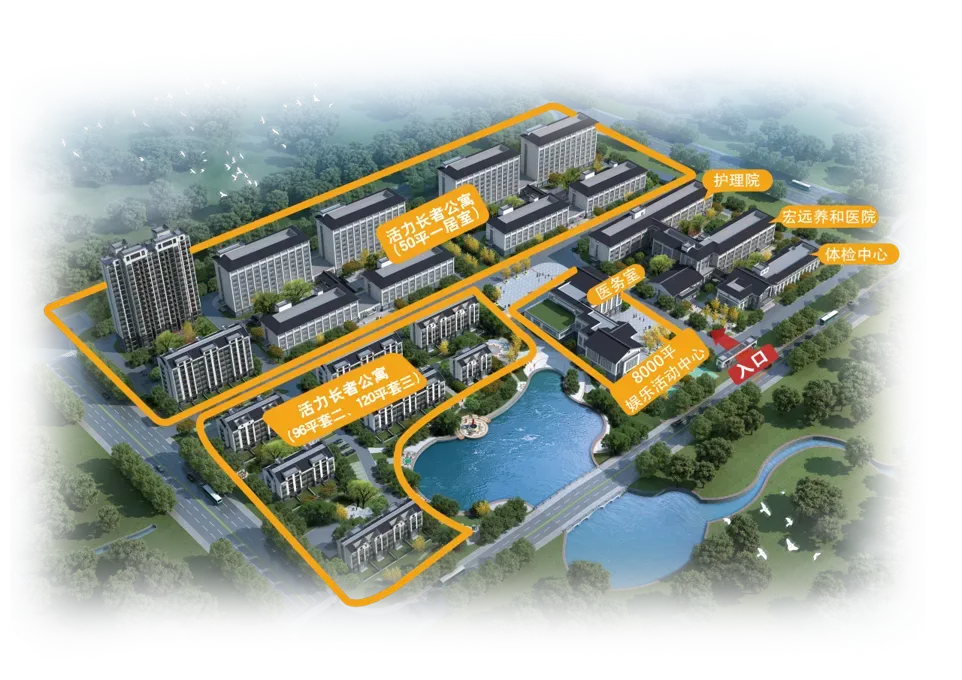 集合体检中心、专科医院、护理院、活力长者公寓、8000平娱乐中心五大板块为一体的综合性社区!