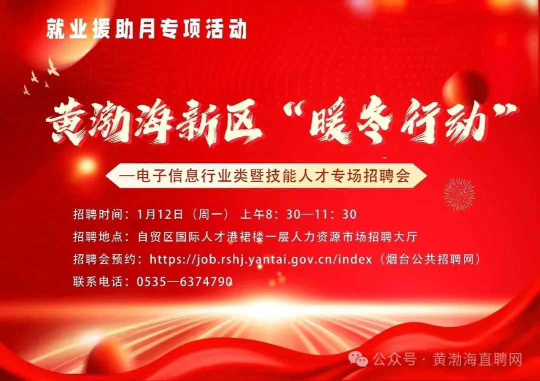 【烟台直聘网】烟台黄渤海新区1月12日“暖冬行动”专场招聘会来啦!