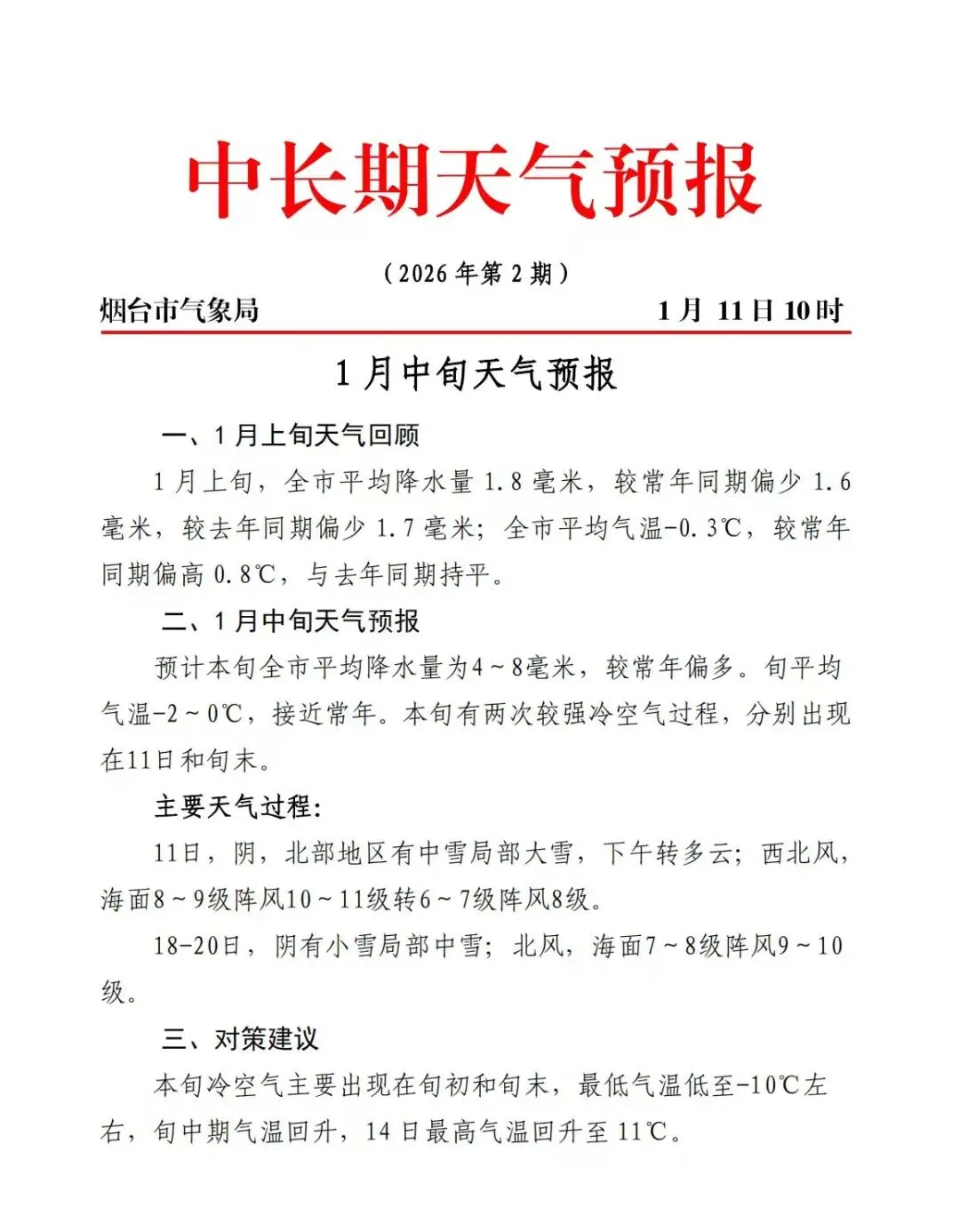 烟台市气象台今天11时发布的天气预报