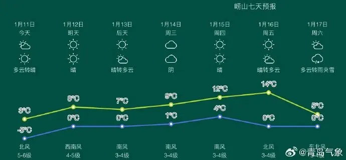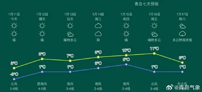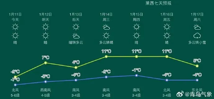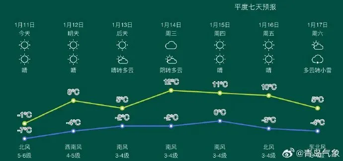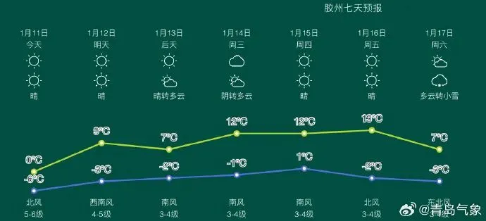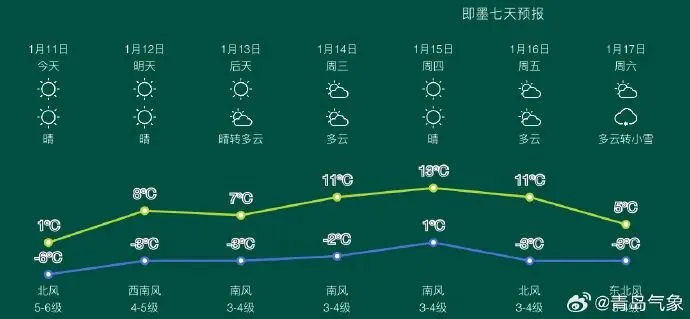 13日白天到夜间:晴转多云,北风转南风3到4级,1到7℃。