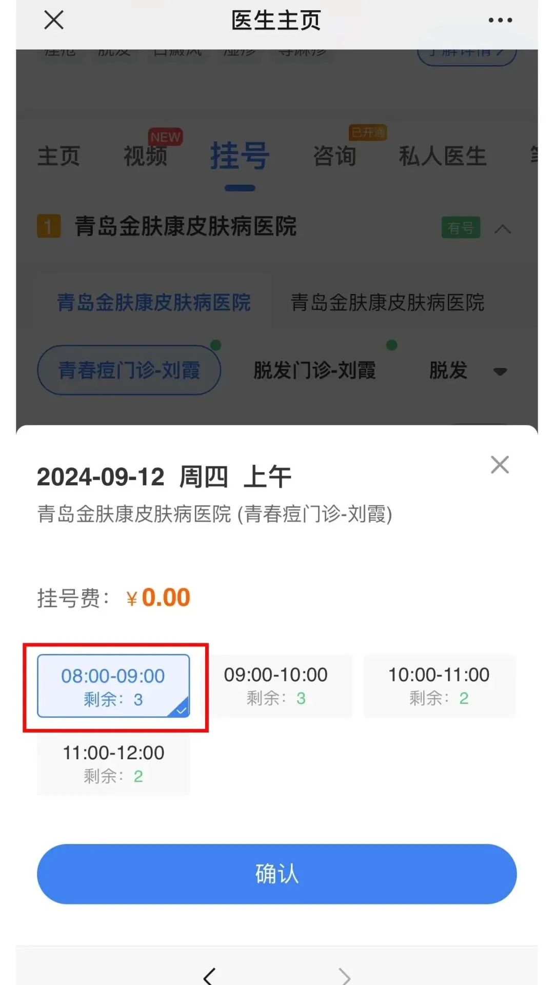 ①进入挂号页面,按需求选择科室及医生,选择预约时间,确认预约信息。