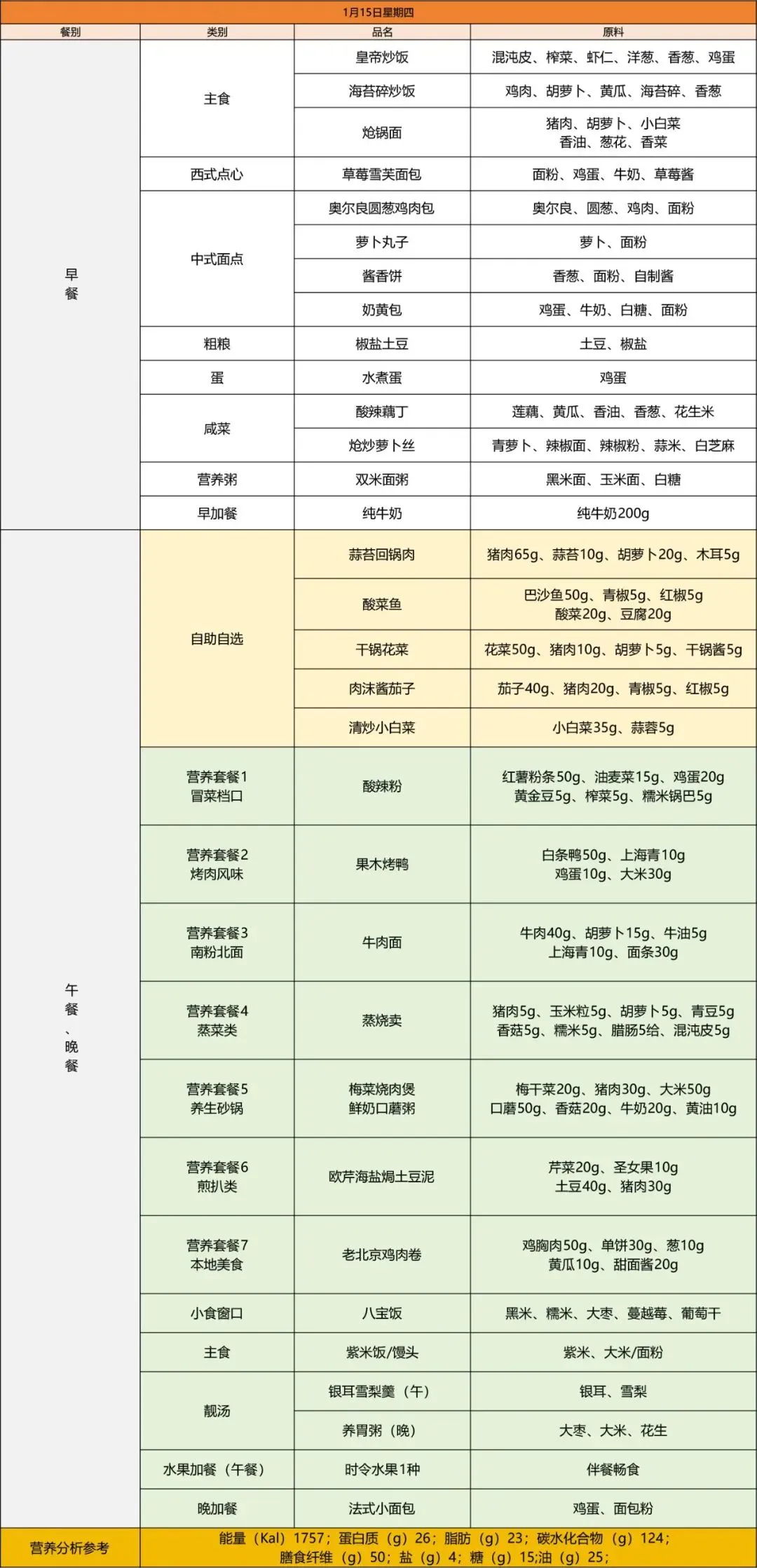 靓汤:银耳雪梨羹(午)、养胃粥(晚)