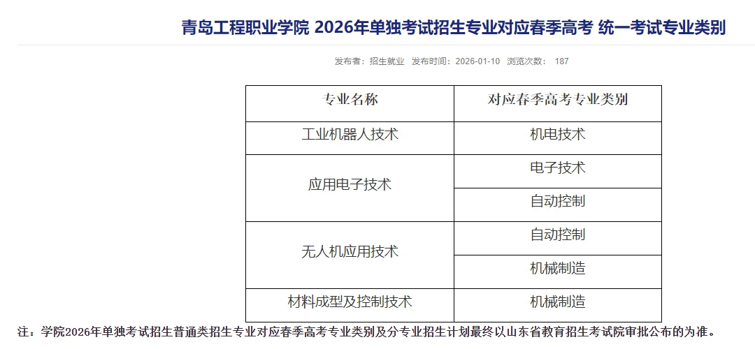 >青岛工程职业学院2026年单独招生专业对应的春季高考类别