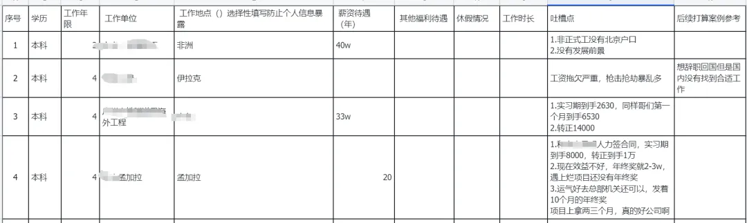 做的一个境外情况汇总表格,便于大家如果想要跳槽或者找寻驻外工作的进行参考,填写完毕的可以截图自己填写的部分,+V:hmdstory(黑名单story),发送截图领取付费版的境外避坑黑名单,扫码即可填写需要进入海外避坑群,+V:hmdstory(黑名单story),发送:海外。