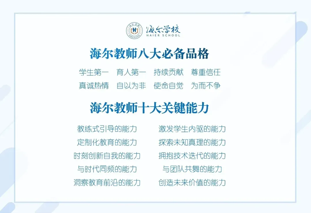 海尔学校是海尔集团建设的一所以创新人才培养为特色的创新型高中,学校以学生发展为核心,围绕着“造就未来世界贡献者”的育人目标和“现代教育的风向标、未来教育的领航者”的办学目标,以个性发展教育为支点,定制化教育为杠杆,人工智能+教育为引擎,师生合一为合力,铸就“尊重人,激发人,成就人”的教育文化环境,致力于建设一所扎根中国大地,面向未来的创新型、研究型学校,构建以科技、艺术、商业管理为支撑的创新人才培养高地。