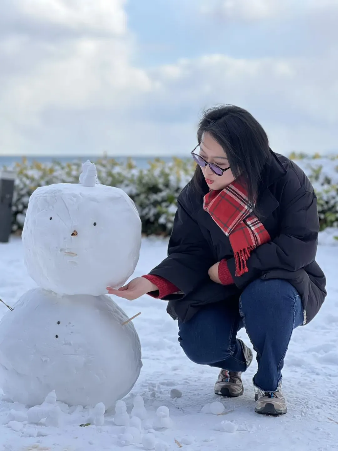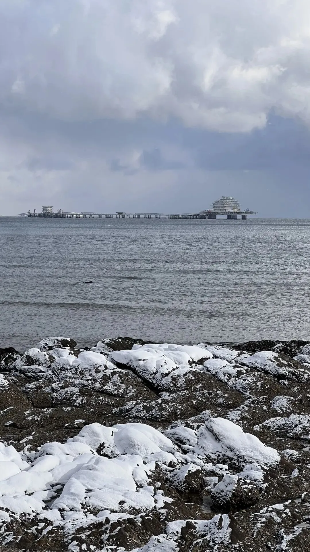 雪是今天凌晨下的,能有十公分厚。清雪车已经把主路上的雪推到了路边,隔着四五米宽的人行道,阳光穿过云层洒在海面上,波光粼粼。纯净的天空中大团大团的白云堆积在天边,岸上黑乎乎的礁石也都顶着白雪,像淋了白霜糖的黑骑士面包。转眼乌云又升腾了起来,企图遮住蓝色的天空。