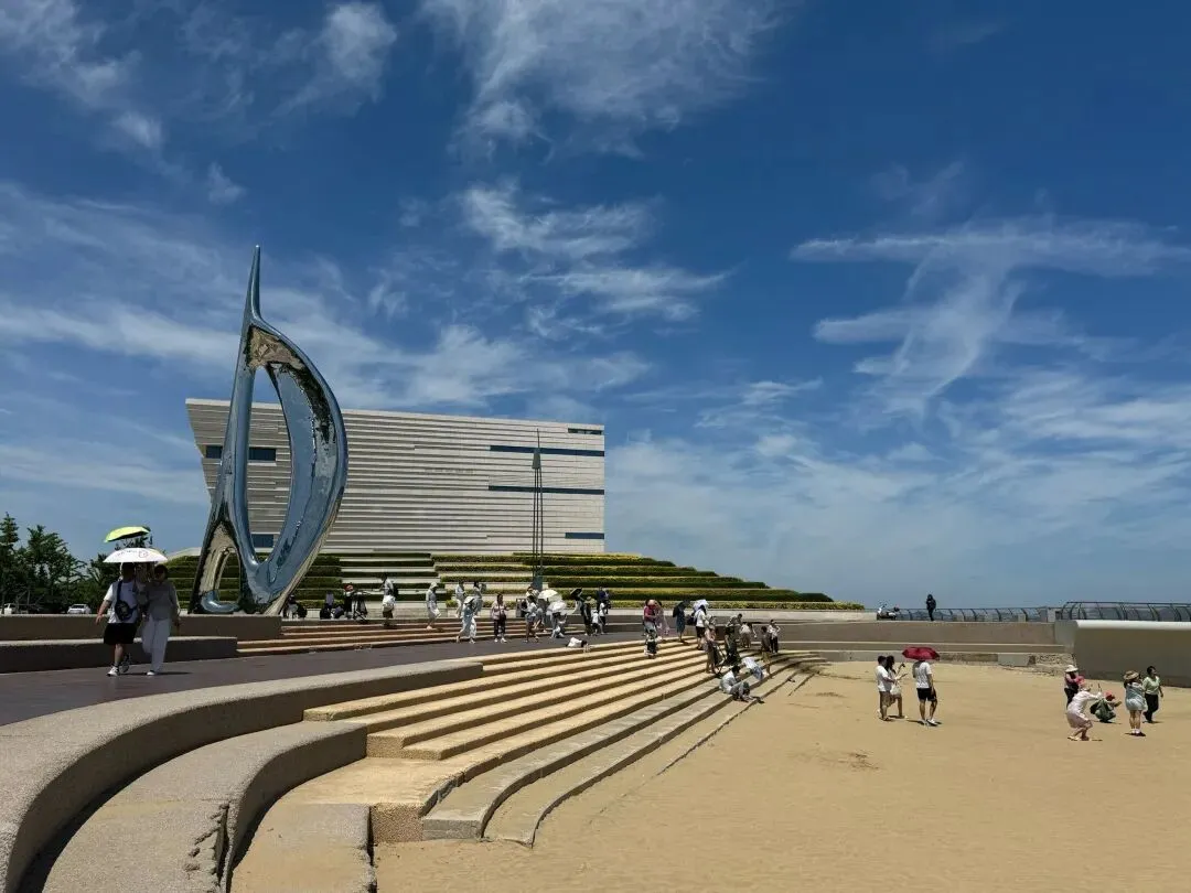 这里的日落是一定要看的,傍晚时分,夕阳把天空染成橘红色,云朵像被点燃了一样,金光洒在海面上,海浪变成了一条条金色的带子,随着风轻轻摇晃。沿海岸线立着的6座雕塑,在夕阳下更有韵味,有的像展翅的海鸥,有的像戏水的海豚,仿佛是神仙落在海边的画笔,添上了最灵动的一笔。春天的海水浴场风和日丽,海边的槐树林郁郁葱葱;秋天的海浪翻涌,拍打着沙滩溅起玉珠似的水花;冬天的激浪排空,气势磅礴,四季的风景各有各的美。