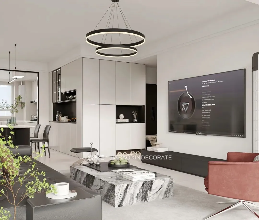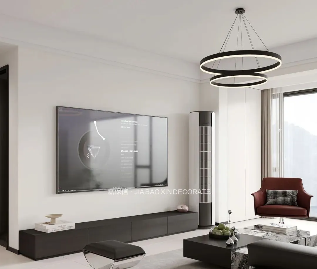 阳台与客厅打通,形成一个开阔明亮的大空间。黑白灰的中性色调贯穿始终,简约中透出高级感。电视墙选用白色墙体搭配黑色地台,既方便随手置物,也保持了视觉上的干净大气。环形吊灯层次丰富,编织出柔和轻盈的光影氛围。