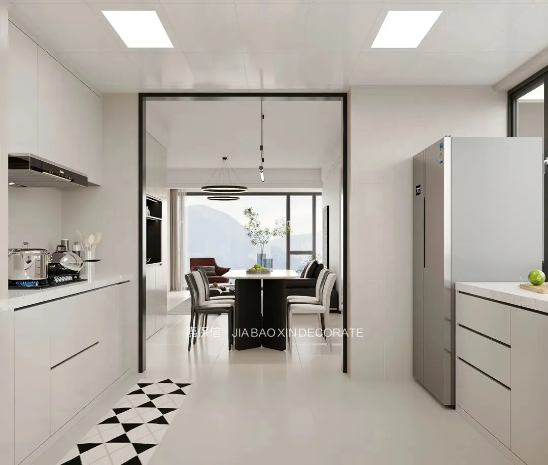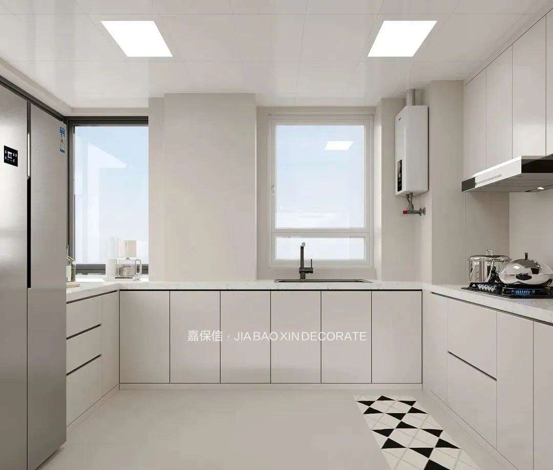转身走进厨房,U型布局让下厨动线清晰流畅。黑白撞色的小块地砖,与白色橱柜、黑色线条默契呼应,延续了客厅的中性色调。大理石台面上,水槽、灶具依次排开,备菜、清洗、烹饪一气呵成。光源悄然藏于吊顶之中,白天是简约风格的装饰,入夜便洒落温柔光晕。