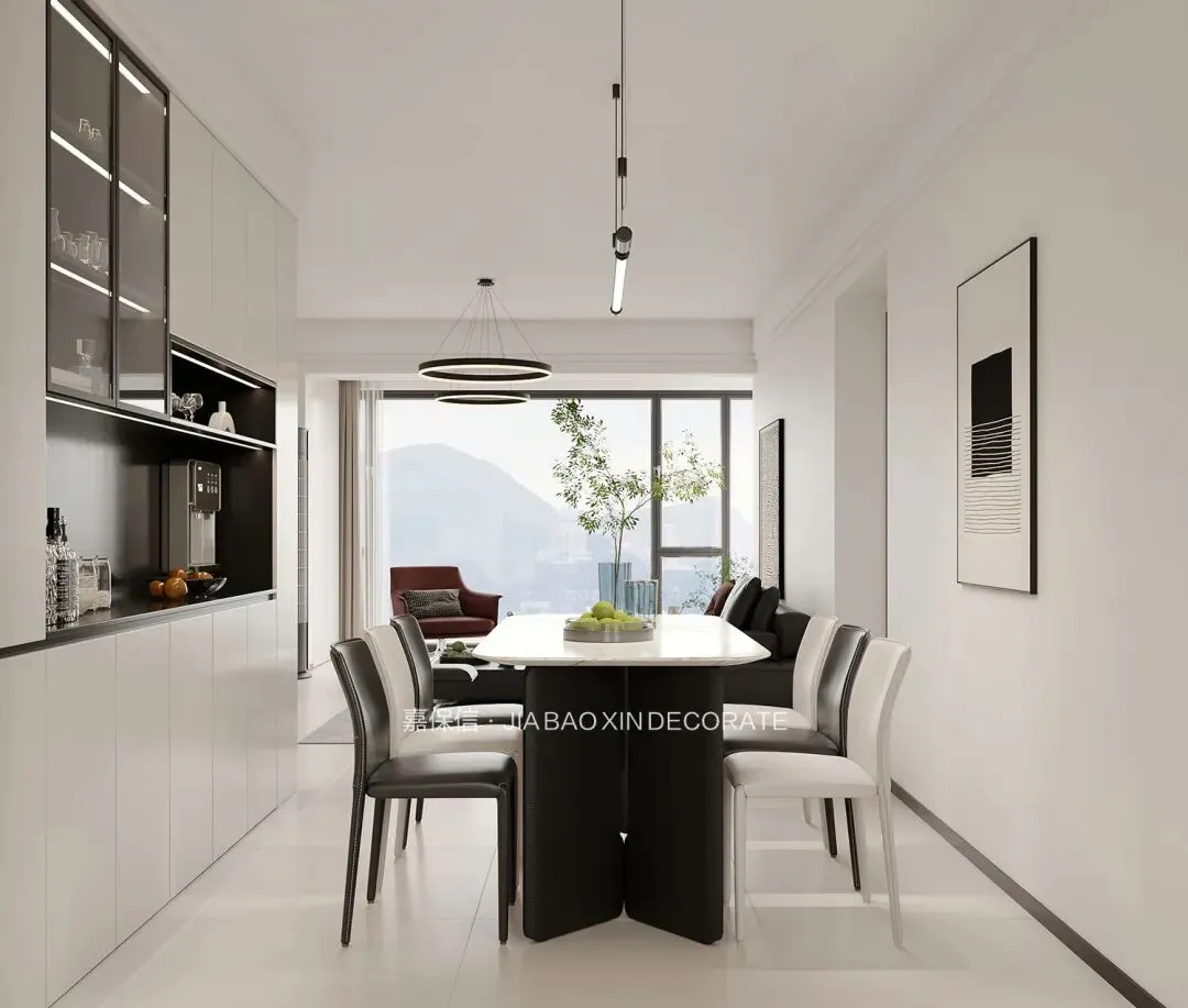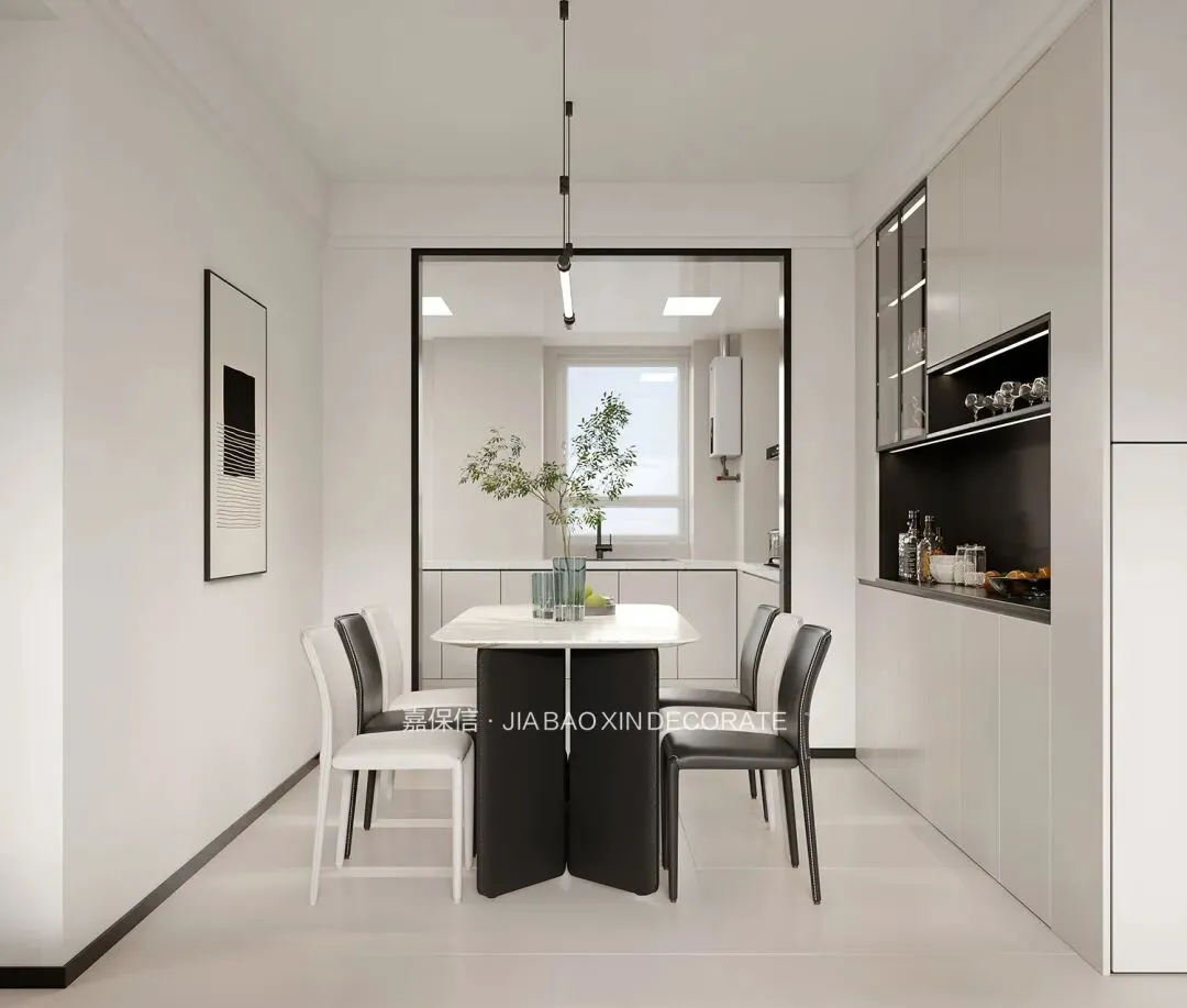 来到餐厅,黑白相间的餐椅与黑白撞色餐桌相映,简约中透着温馨。餐边柜巧妙嵌入墙体,兼具展示与储物,内置灯光点亮杯盏,使其流光溢彩。黑白撞色的装饰画呼应着黑色踢脚线和白色墙面,配色和谐统一。一束插花、一盘鲜果,为日常餐食增添了些许仪式感。
