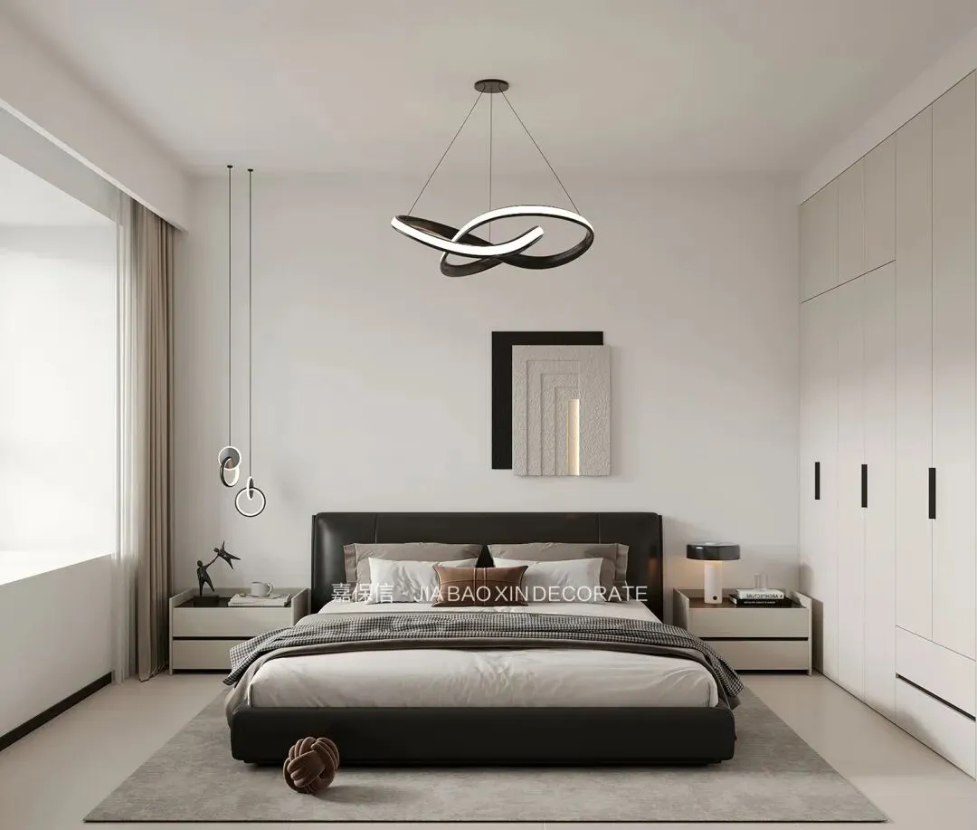 步入卧室,黑白灰中融入一抹暖棕,营造出静谧舒适的休憩氛围。夜幕降临时,两盏吊灯次第亮起,温柔点亮属于夜晚的松弛时刻。对称的床头柜收好日常琐碎,通顶衣柜藏下四季衣物。灰色地毯带来柔软的触感,同时拓宽了休息区。一夜好眠,由此开启。