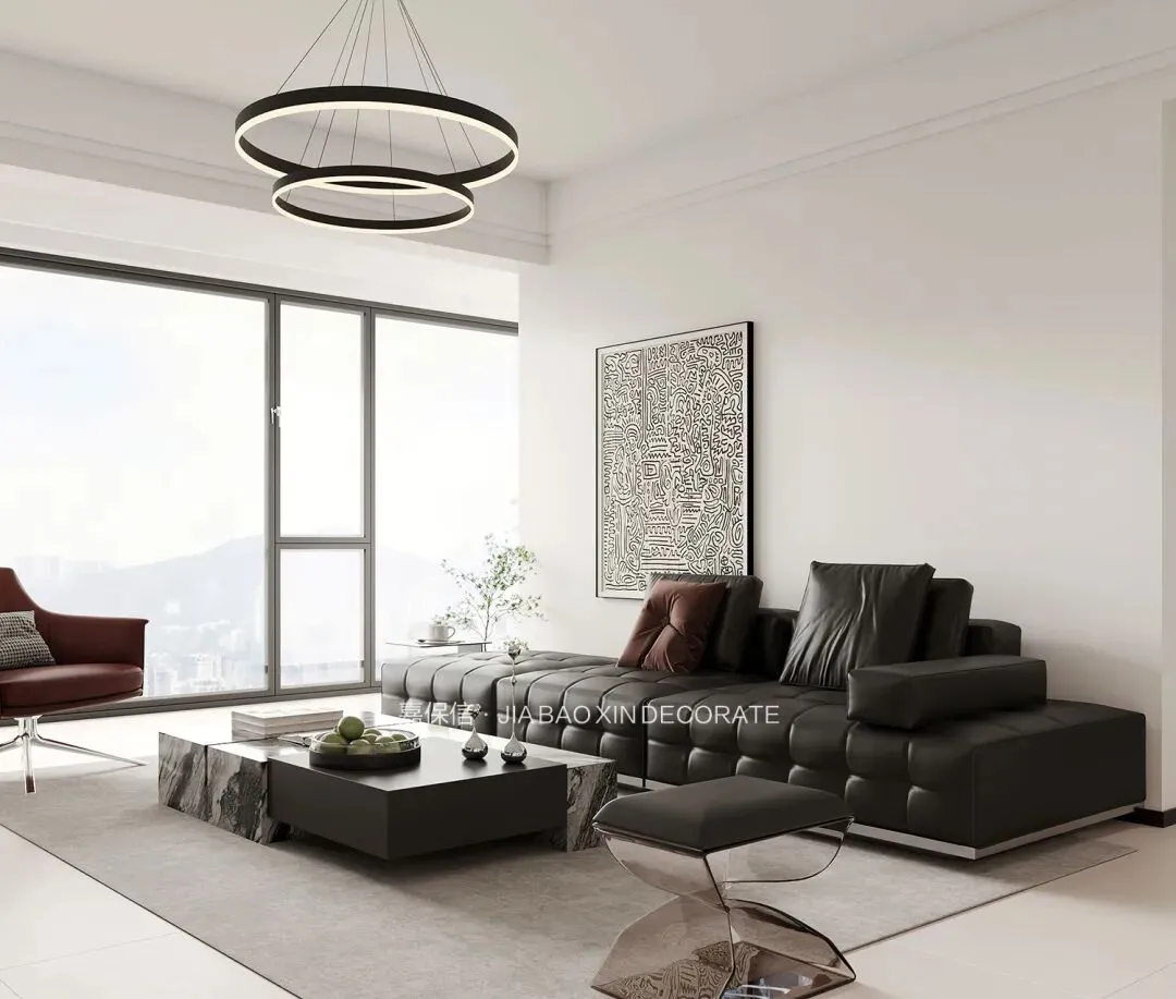 落地窗将自然光与城市风景一起邀请进来,抬眼便能望见远方,舒缓解压。回到家中,可以随意坐卧在黑色皮沙发上,享受全然的放松。灰色地毯与大理石茶几的搭配,既拓宽了舒适区,也为空间注入几分时尚气息。