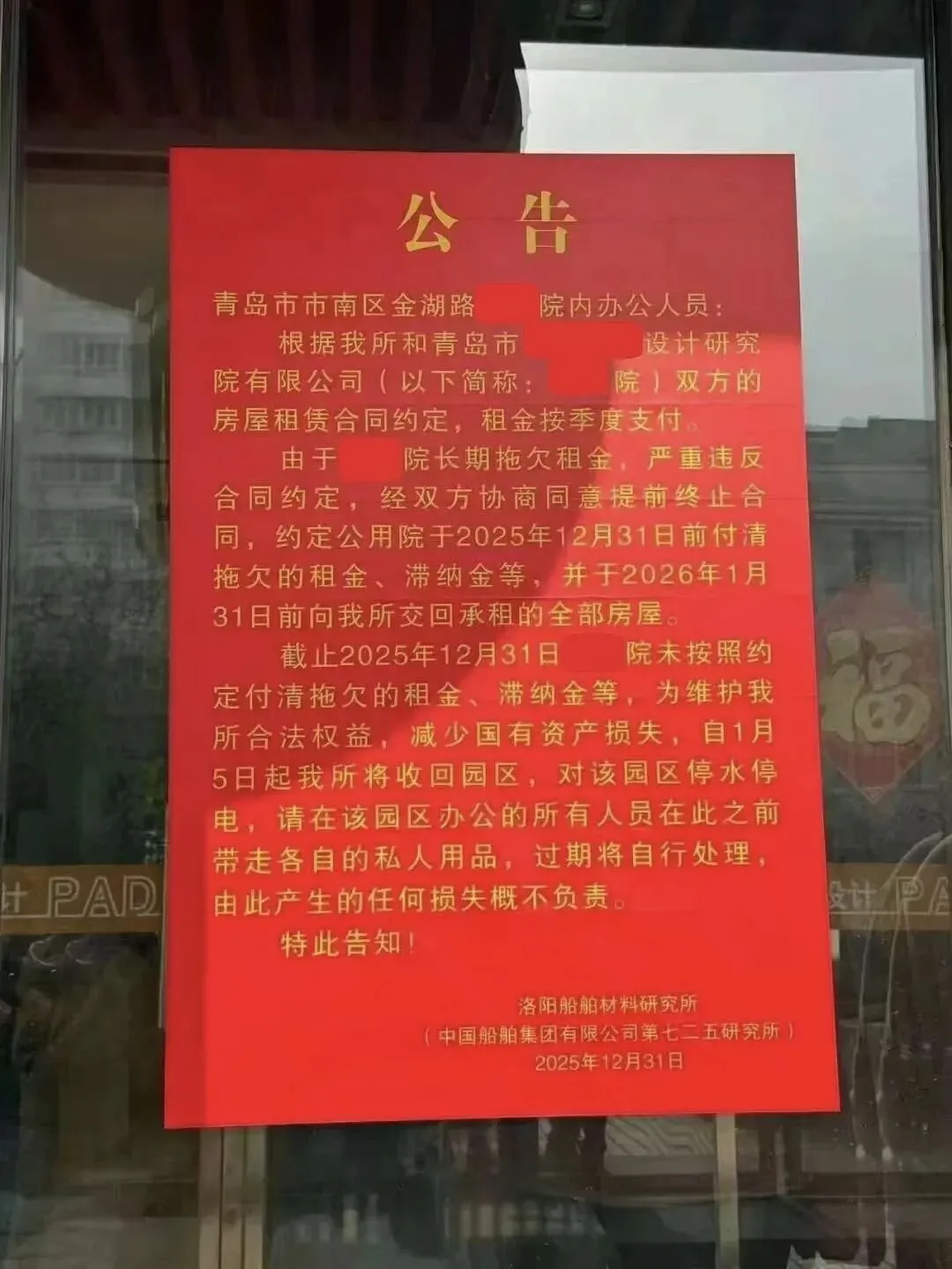 公告要求该设计院在2025年12月31日前交清与房租相关的费用,但设计院并未履行,房东决定2026年1月5日要收回园区了,该设计院只能另寻其他地方了。