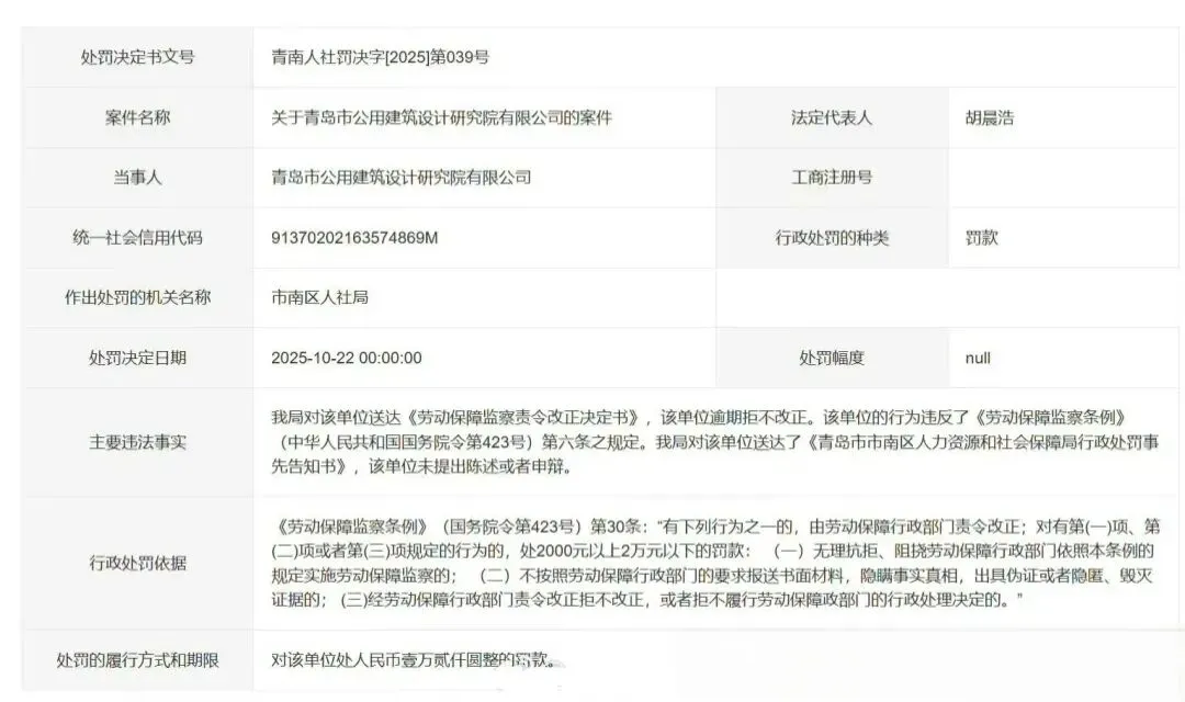 2025年10月,青岛这家设计院还被青岛市市南区人设局开了罚单,具体如下图。