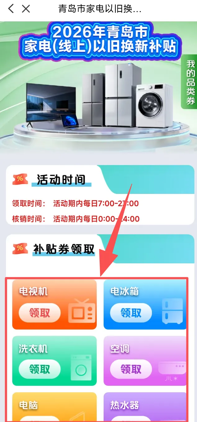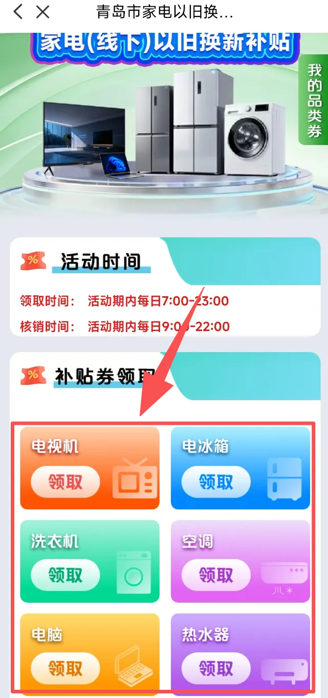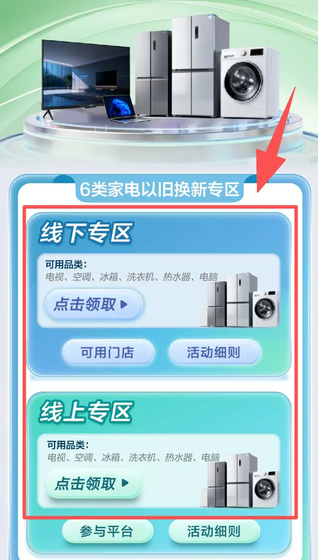 消费者通过云闪付APP首页-“本地精彩”-“青岛以旧换新”-“家电以旧换新专区”-“6类家电以旧换新专区”-“线下专区”,可领取6类家电补贴券。活动期内,每个消费者针对每类家电每次可领取一级能效或水效补贴券1张;补贴券过期后,可再次领取,但每类家电补贴券累计最多领取6次;每类家电补贴券仅可使用1张。领取补贴券前,请将APP升级到最新版本,消费者需打开参与活动设备的GPS才能参与活动。特别提示:线上券、线下券共同限制使用次数。消费者已在其他省市领取的同一品类补贴券,无法在本活动重复领取。