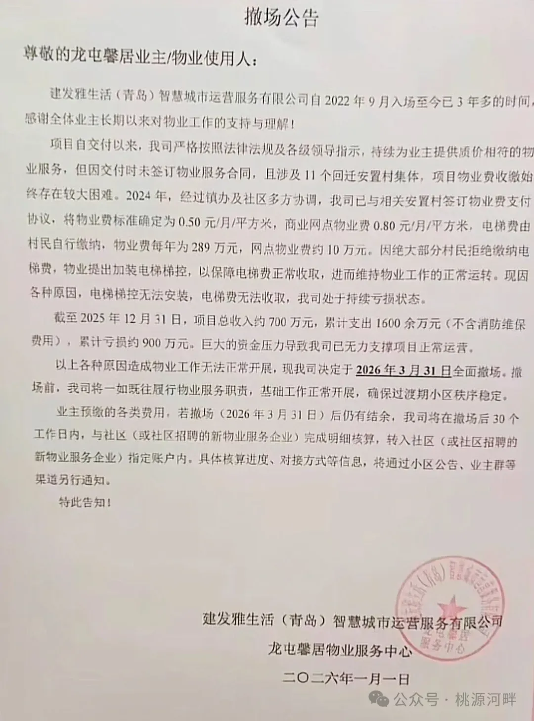 2026年刚刚开始,胶州李哥庄镇大型社区、胶州市乃至青岛市最大规模的回迁安置项目“龙屯馨居”小区的物业服务公司“建发雅生活(青岛)智慧城市运营服务有限公司”要撤场了。原因是3年以来累计亏损近900万元,巨大的亏损导致物业公司无力支撑项目正常运转,计划2026年3月31日全面撤场。据了解,2023年2月14日,中建八局投资建设运营的青岛市最大回迁安置项目——青岛李哥庄镇新型城镇化PPP项目安置区A1-A5地块开启交付,本次交付房屋5154套,将为镇域11个村、1万余安置村民打造的温馨家园。据查询得知,建发雅生活(青岛)智慧城市运营服务有限公司属于国有企业,公司成立于2021年08月04日,注册地位于山东省青岛市胶州市中云街道办事处兰州西路,注册资本2000万元,由青岛国大领筑城市服务有限公司持股51%、雅生活智慧物业服务有限公司持股49%,而青岛国大领筑城市服务有限公司则由青岛上合控股发展集团有限公司间接100%控股。检索获悉,胶州李哥庄镇政府已引入建发雅生活作为服务单位,由其提供相关市政环卫(人居环境整治)、政府物业服务等服务内容。来源:桃源河畔