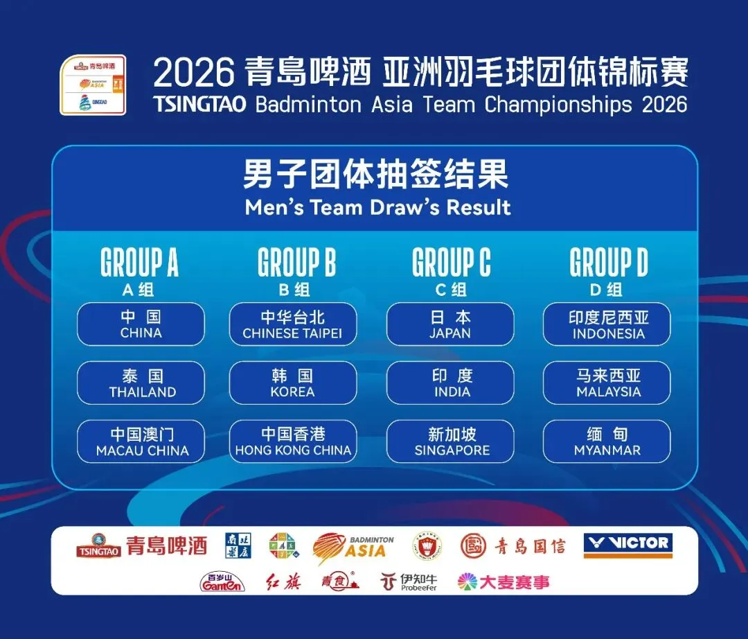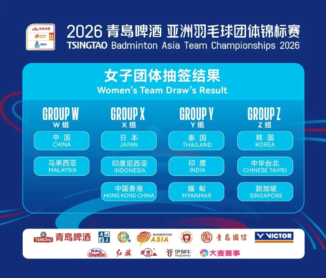 1月9日,2026青岛啤酒亚洲羽毛球团体锦标赛(以下简称“亚团赛”)进行了小组抽签仪式。本届赛事分为男子团体与女子团体两个项目,男团方面,中国队作为卫冕冠军与泰国队、中国澳门队位列A组;女团方面,中国女团作为头号种子与马来西亚队一起被分入W组。
