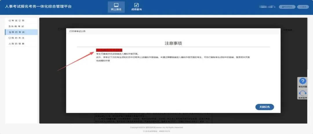 此外,准考证下方的考生须知栏目中亦附有上述“考试模拟系统”在线模拟作答链接。未通过弹窗链接进入模拟作答页面的考生,可自行复制考生须知中的链接,登录相关页面完成模拟作答。