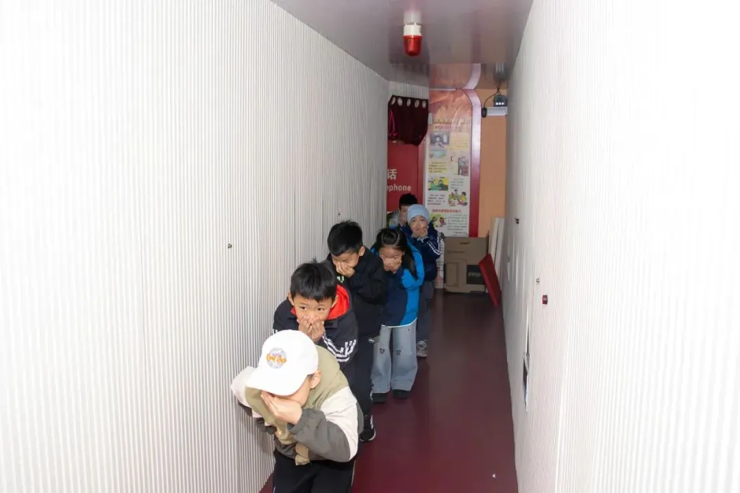 消防安全教育的最终环节——模拟逃生演练。在志愿者引导下,孩子们牢记“弯腰低姿、湿巾捂鼻”的要领,沿着墙面绿色荧光指示牌,快速有序地穿过逃生通道。这场逃生体验不仅检验了孩子们对消防知识的学习成果,更让他们在实践中掌握了关键的自救技能。