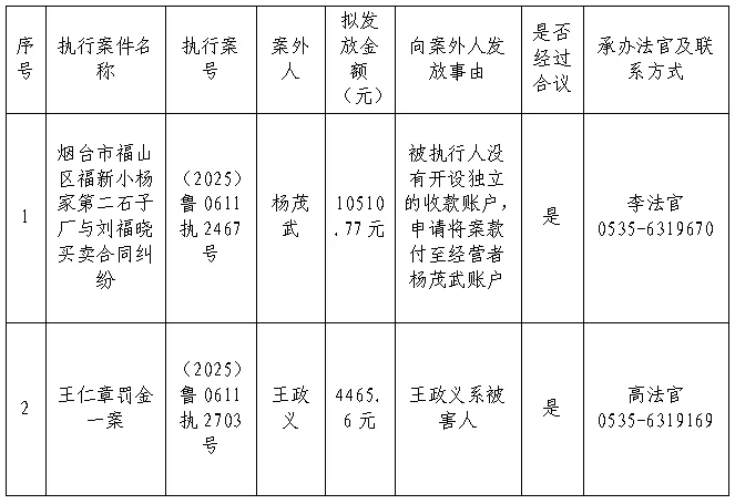 烟台市福山区人民法院关于向案外人发放执行案款的公示(2026年第1期)