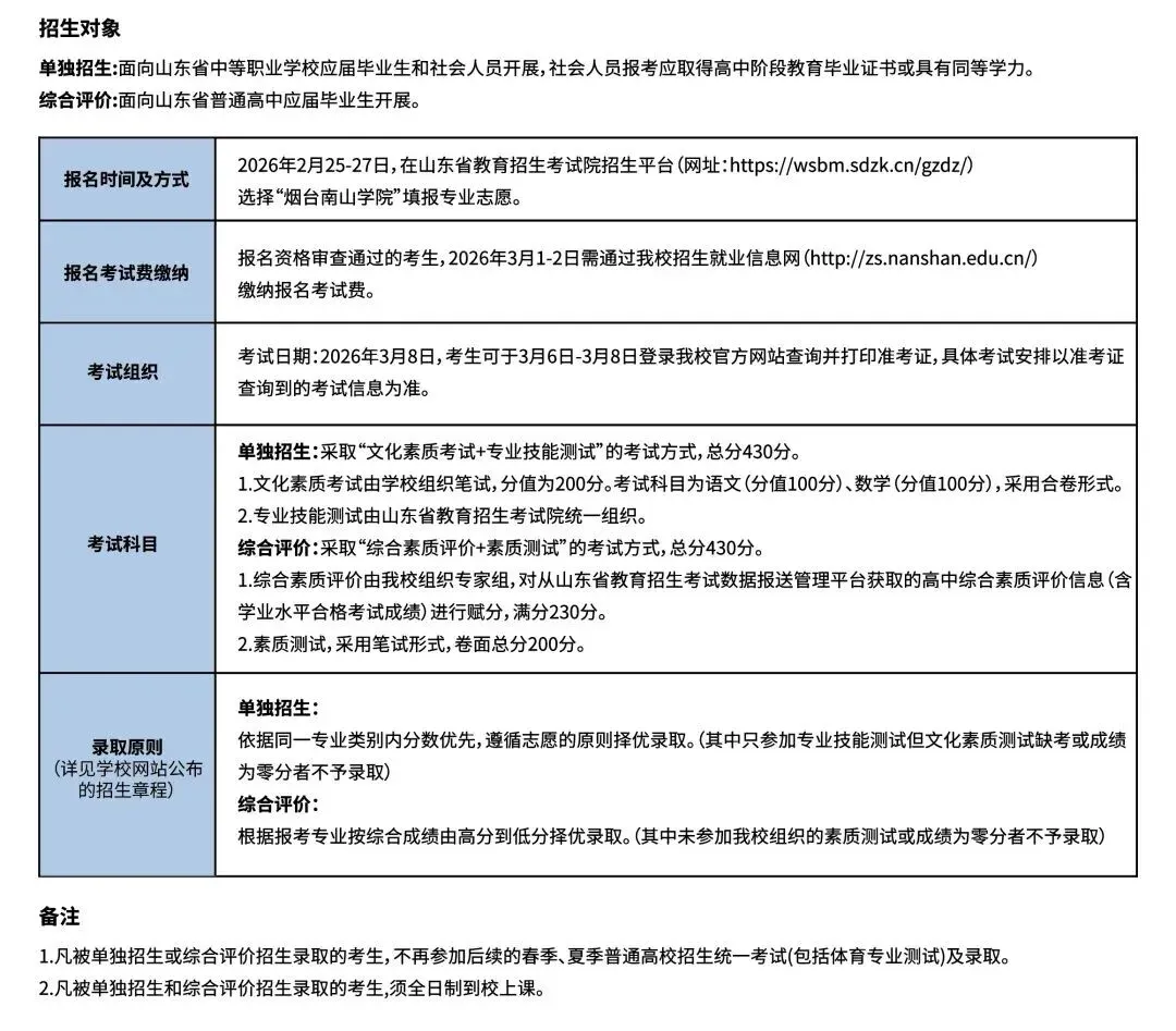 烟台南山学院2026年单独招生及综合评价招生简章
