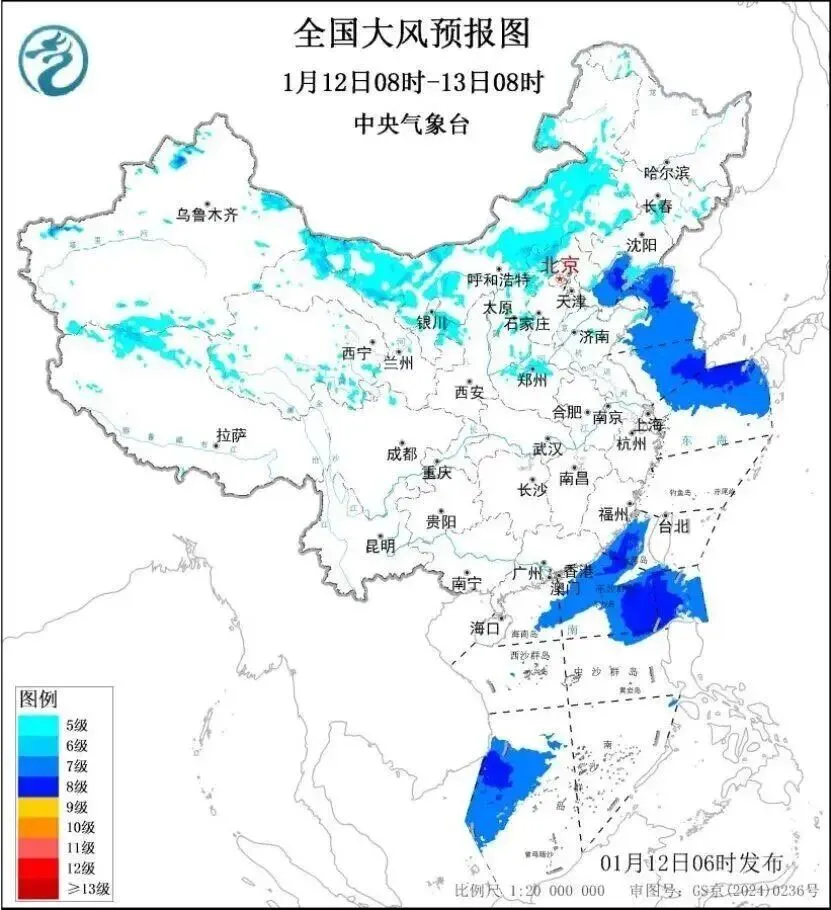 中央气象台1月12日6时继续发布大风蓝色预警。预计,1月12日8时至13日8时,内蒙古中西部、甘肃西部、宁夏北部、河北西北部、山东半岛、辽东半岛等地部分地区有5至7级大风、阵风8至10级;渤海、渤海海峡、黄海大部海域、东海北部海域、台湾海峡、巴士海峡、南海东北部和西南部海域将有7至8级、阵风9级的大风。