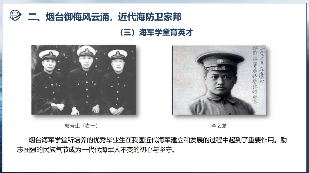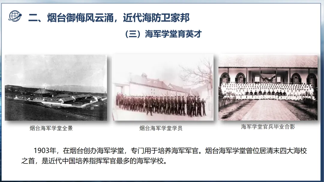 1903年,烟台正式创办海军学堂,专为培养海军军官而设。该校不仅位列清末四大海校之首,更是近代中国培养海军指挥军官数量最多的院校。从这里走出的学子,既为近代中国海军建设注入了关键动能,更将“励志图强、守护海疆”的民族气节深植血脉,成为烟台海防精神的“初代传承者”。